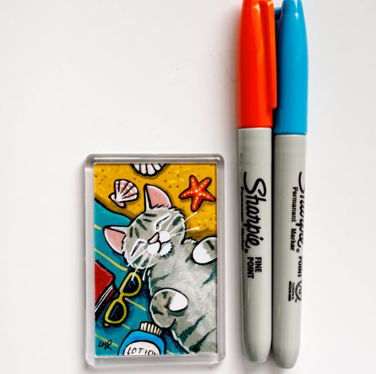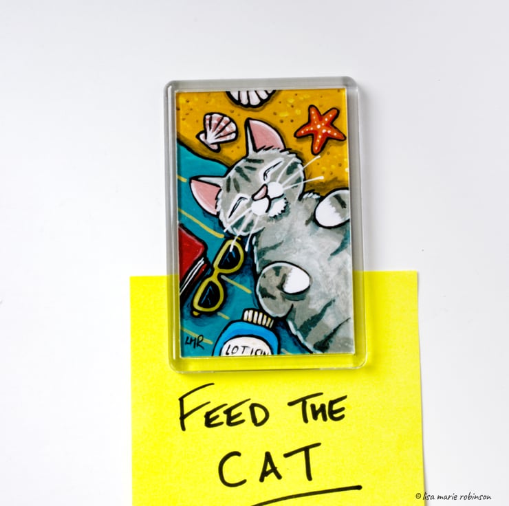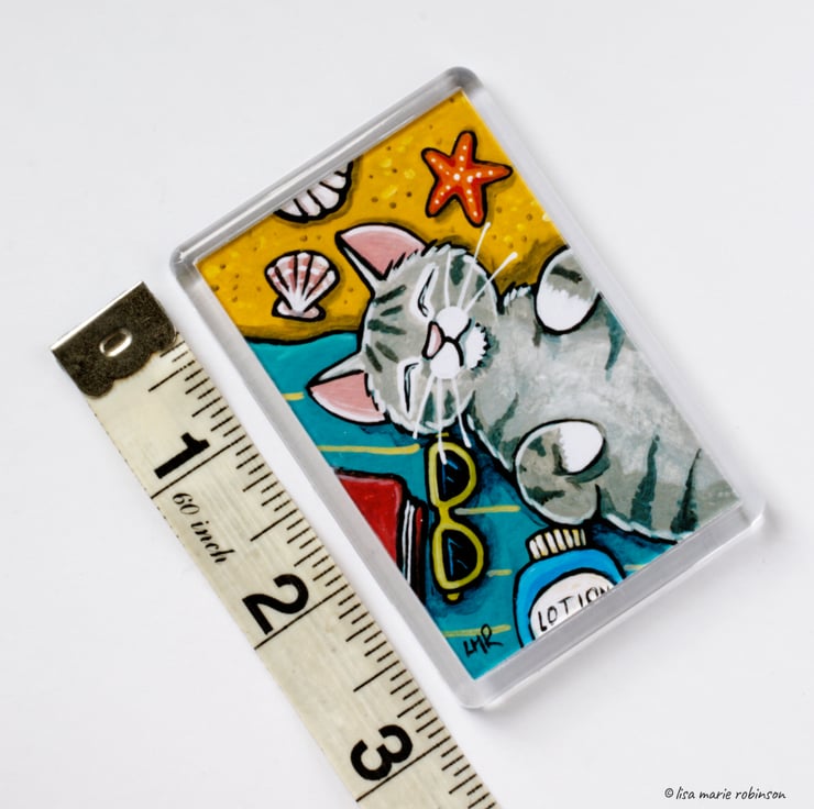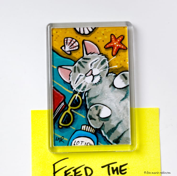 Design features a whimsical style painting of a grey tabby cat sleeping on a towel on a sandy beach. With a book beside him, he must be taking a quick nap after a thrilling read.
