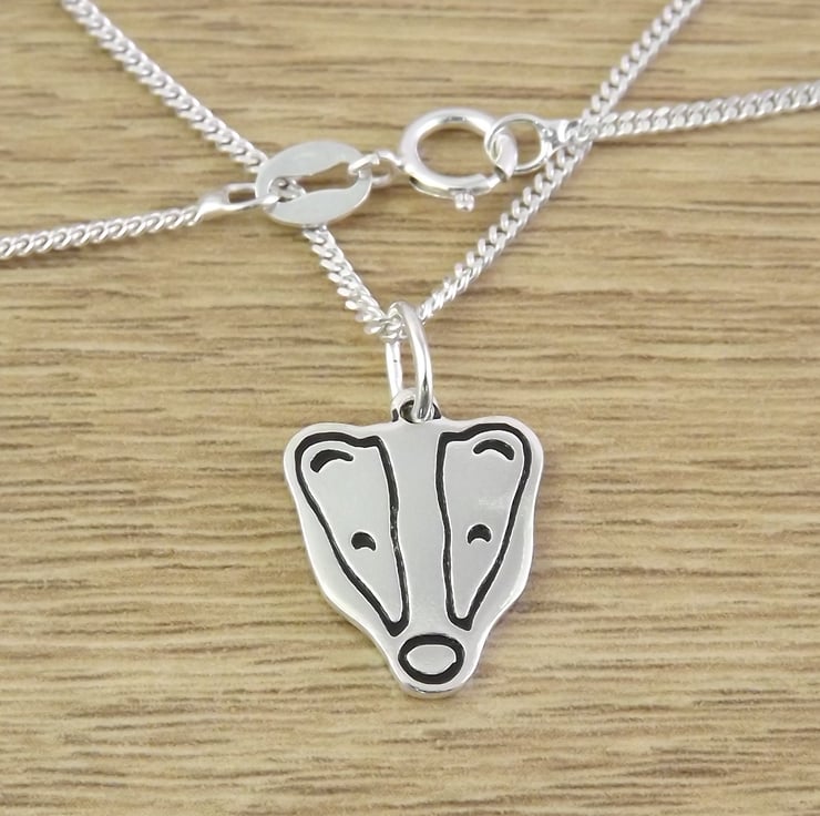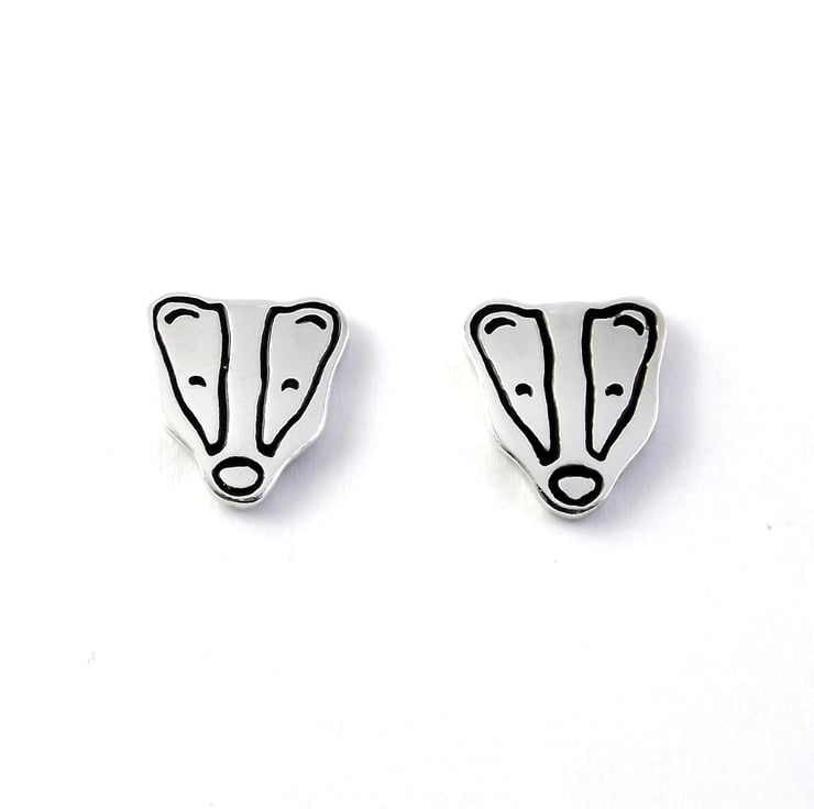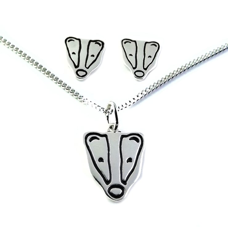 This badger jewellery set includes a pendant and a pair of stud earrings which have been lovingly crafted by hand. They are made from recycled sterling silver and are etched before being cut by hand, the edges are then smoothed using files and emery paper before they're carefully given their shape using a punch and hammer. Pins are then added to the back of the earrings. Black resin based enamel is added to the etched areas before they are polished. They are sent in a box made from 80% recycled cardboard.