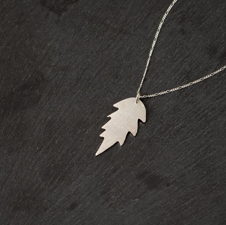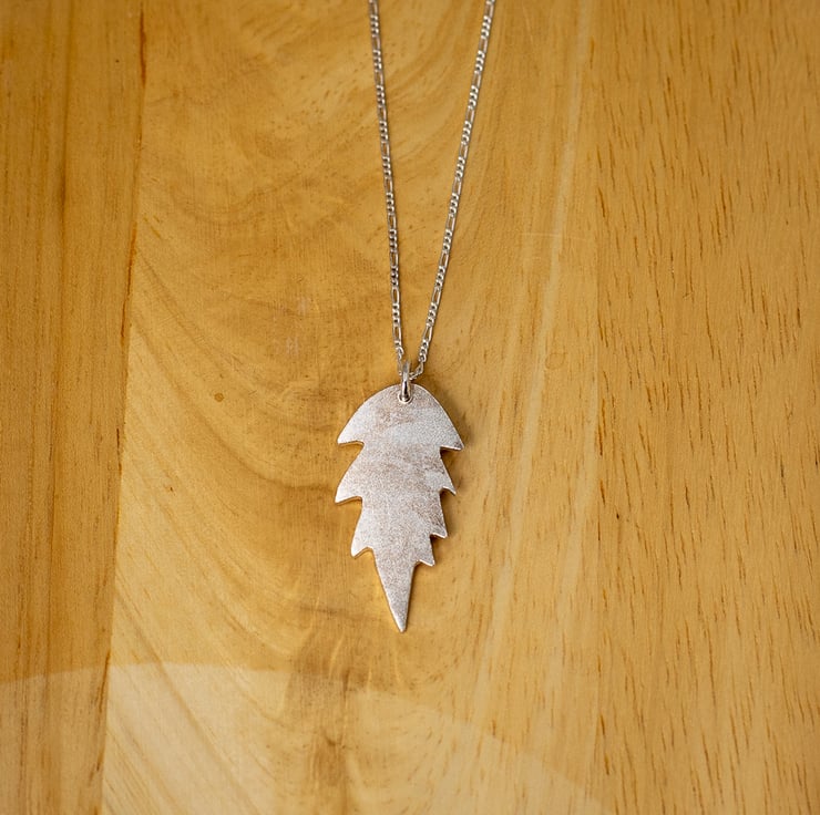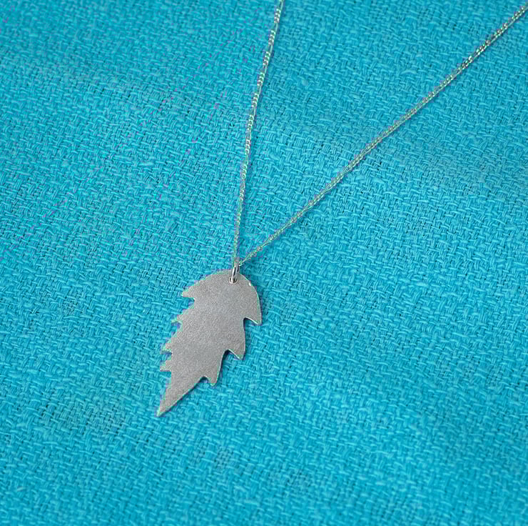 This handmade leaf pendant is handcut from Sterling Silver sheet. It measures 3cm tall and 1.5cm at its widest point.
