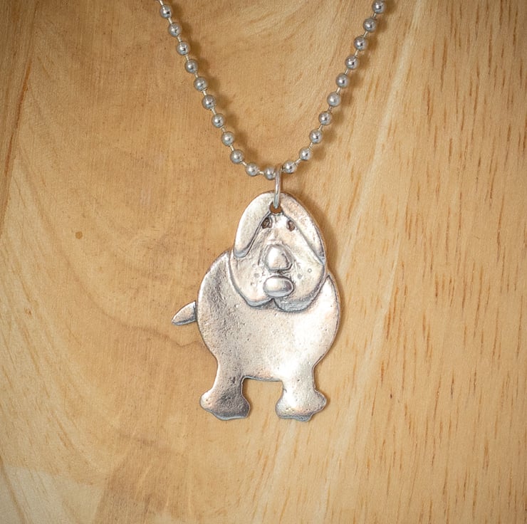 This is a fun stylised dog pendant handmade using silver clay. It is 3cm tall and 2.2cm at its widest point.