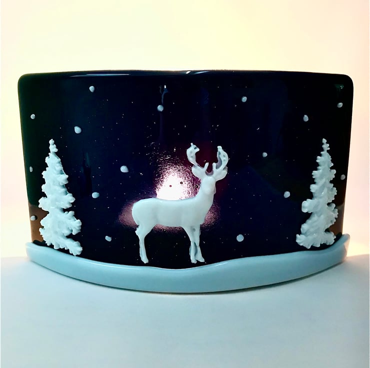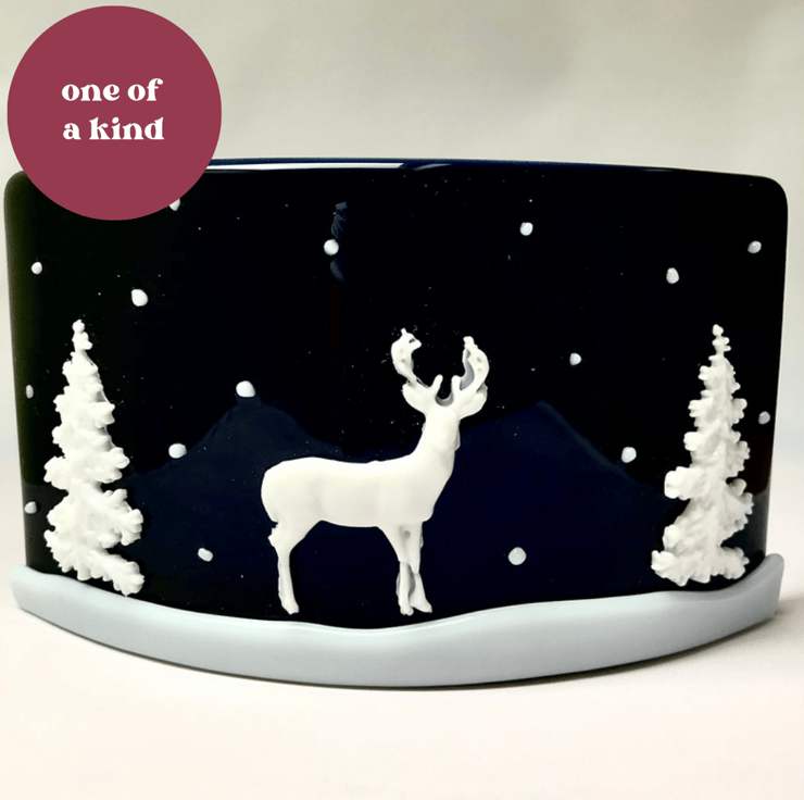 Capture the magic of winter with this Fused Glass Winter Scene Arch, a beautifully handcrafted piece featuring a serene snowy landscape with delicate trees and a reindeer silhouette. This is a one-of-a-kind creation, with no duplicates—making it a perfect choice for those who love unique handmade art.