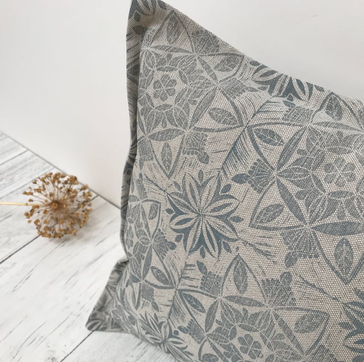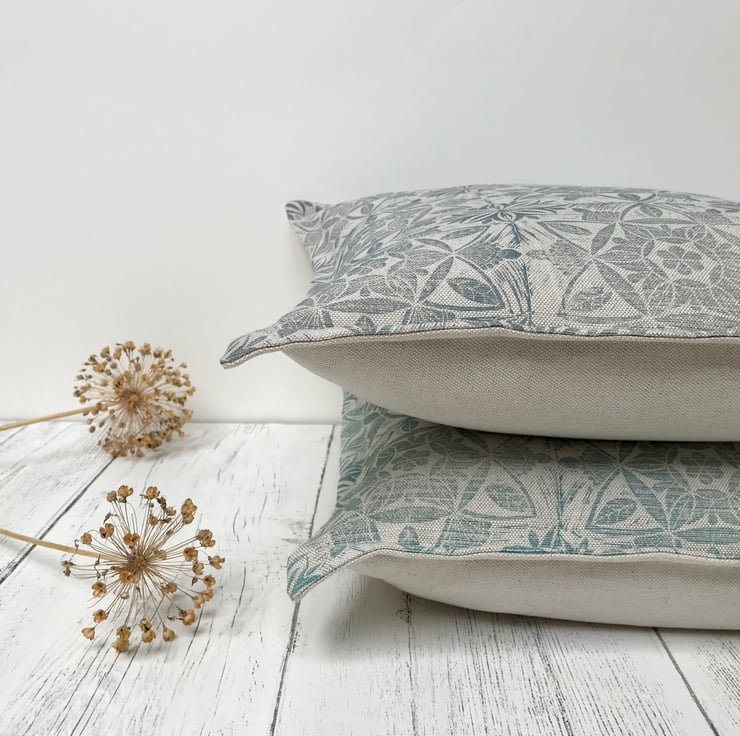 This unique design is block printed by hand using Eco-Friendly inks on to natural linen union fabric woven in Scotland. Finished with a stitched border, the reverse of the cushion is plain linen union fabric with an envelope enclosure