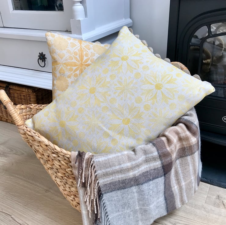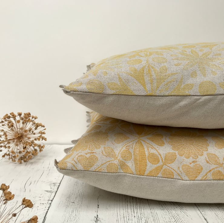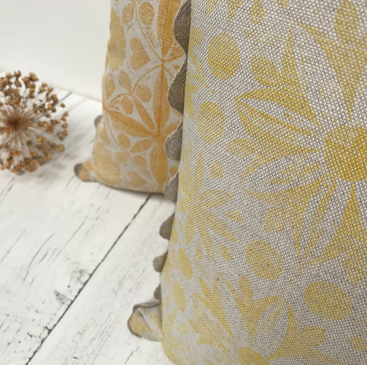 This unique design is block printed by hand using Eco-Friendly inks on to natural Linen Union fabric woven in Scotland. Finished with linen ric rac trim, the reverse of the cushion is plain linen union fabric with an envelope enclosure