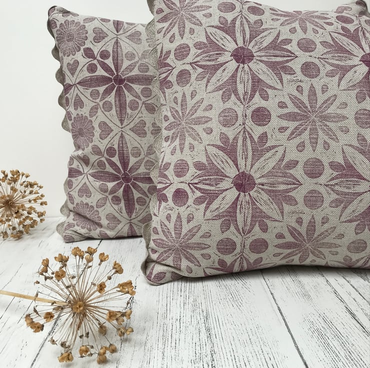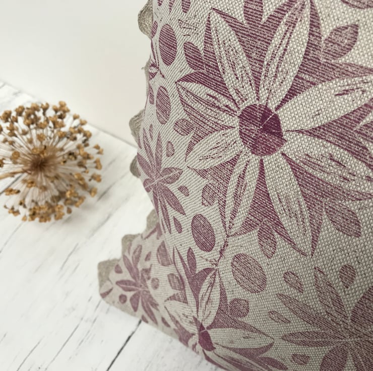 This unique design is block printed by hand using Eco-Friendly inks on to natural Linen Union fabric woven in Scotland. Finished with linen ric rac trim, the reverse of the cushion is plain linen union fabric with an envelope enclosure