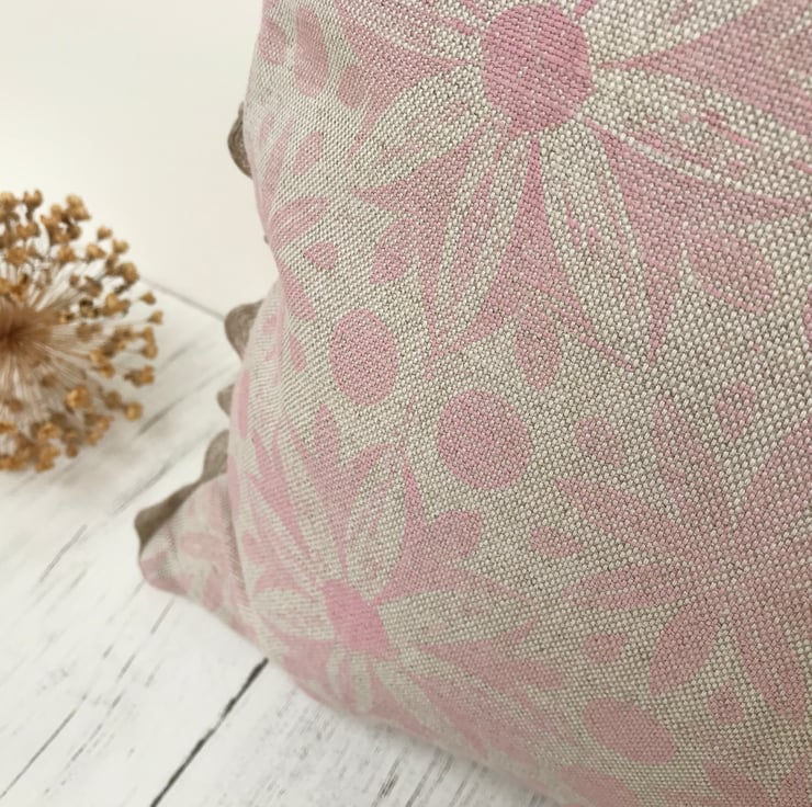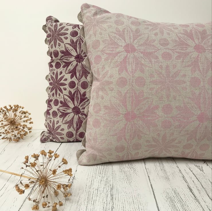 This unique design is block printed by hand using Eco-Friendly inks on to natural Linen Union fabric woven in Scotland. Finished with linen ric rac trim, the reverse of the cushion is plain linen union fabric with an envelope enclosure