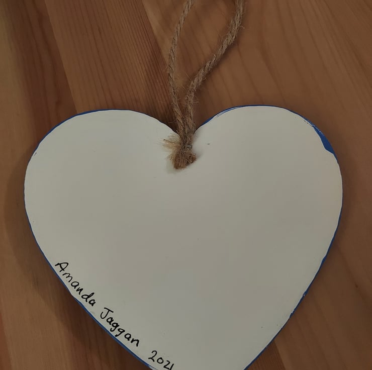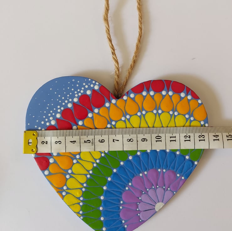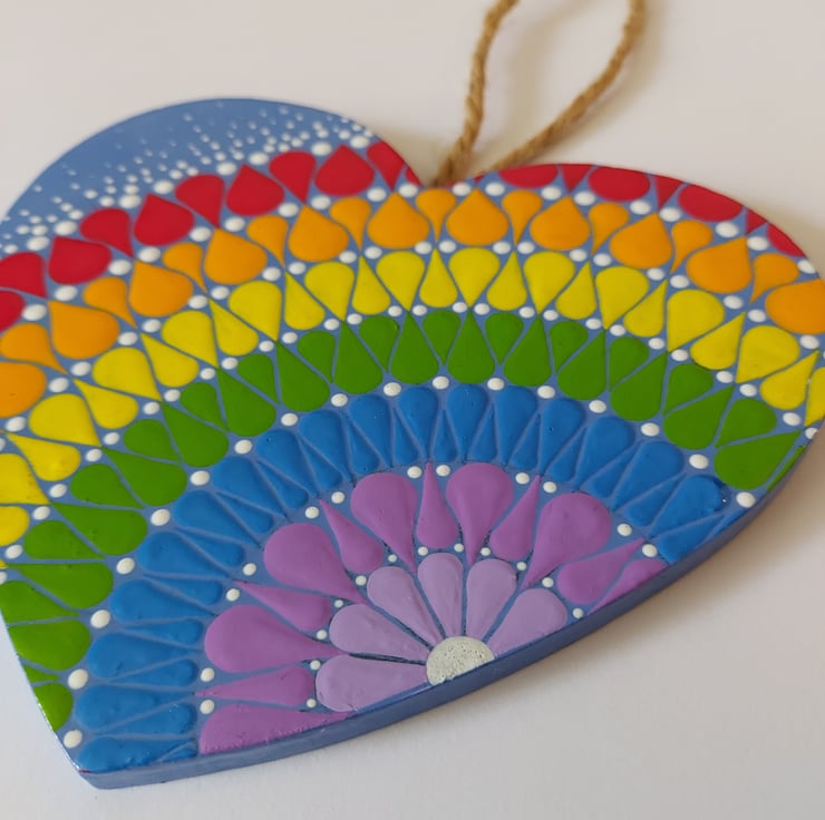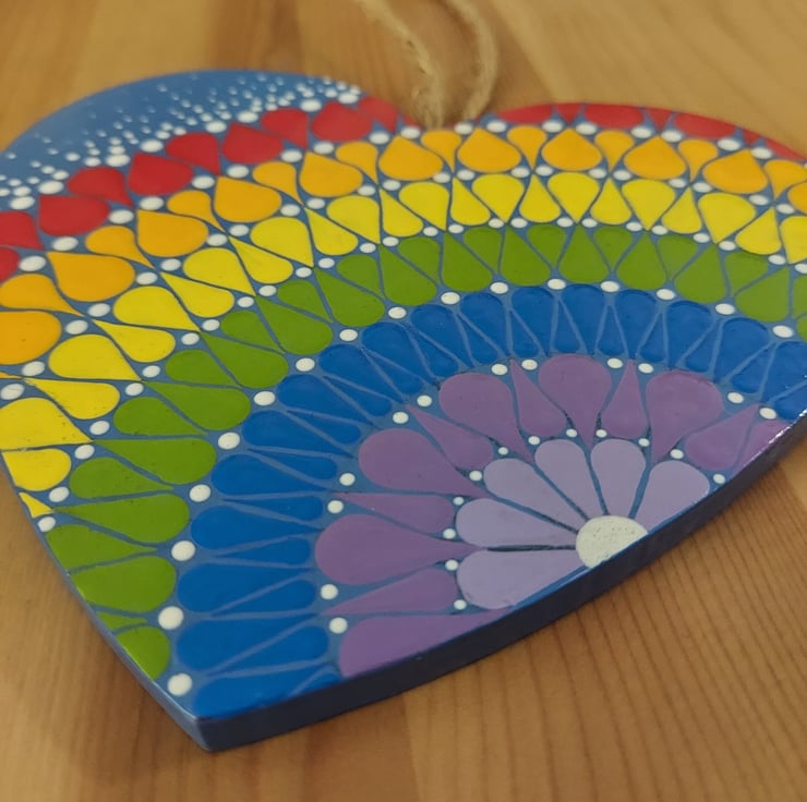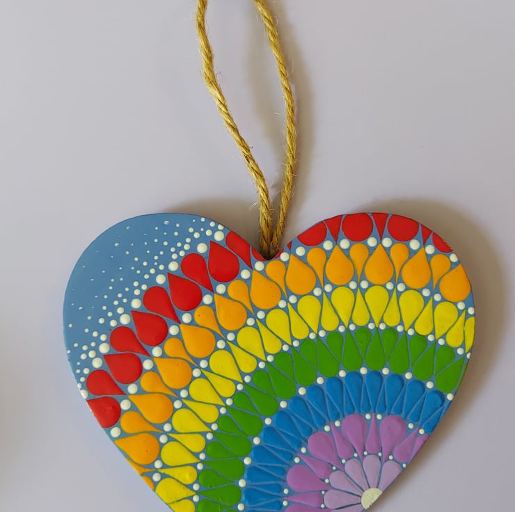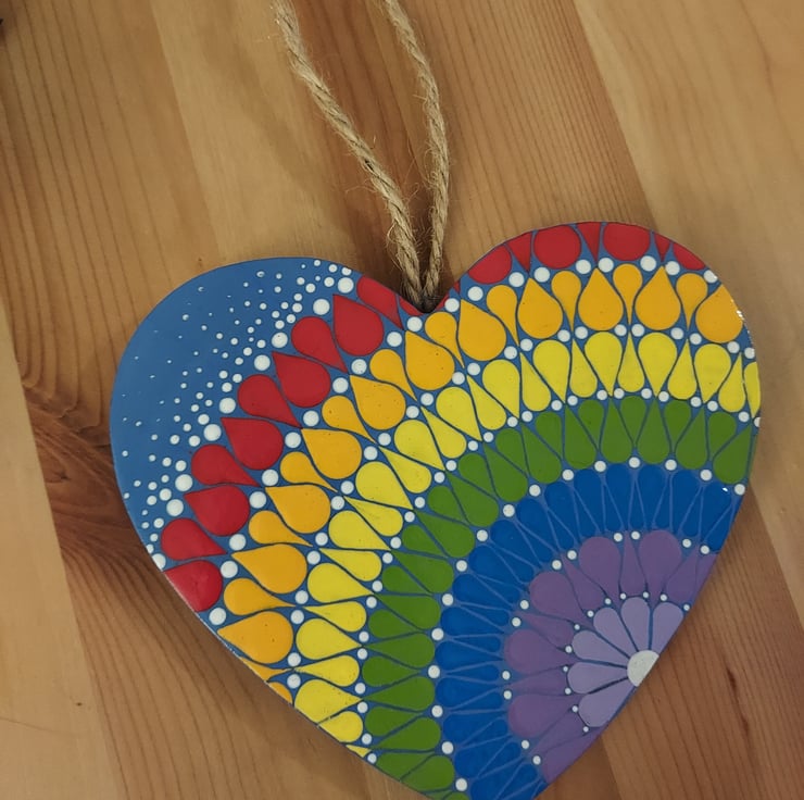 Beautiful, colourful wood heart with a string attached for hanging, hand painted in acrylics and finished with a satin varnish.