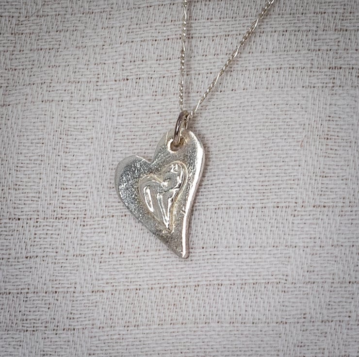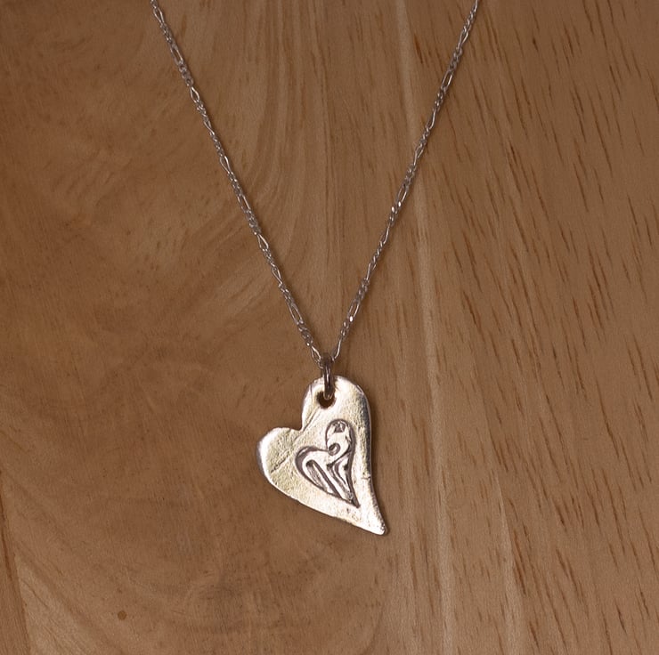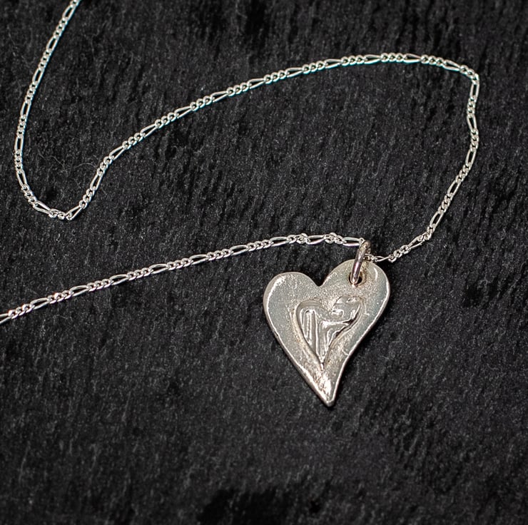 This is a small dainty heart shaped pendant with another patterned heart overlaid in its centre. Handmade with silver clay it measures 2cm tall and 1.4cm wide.