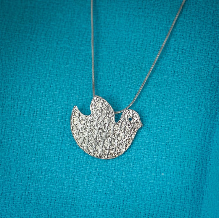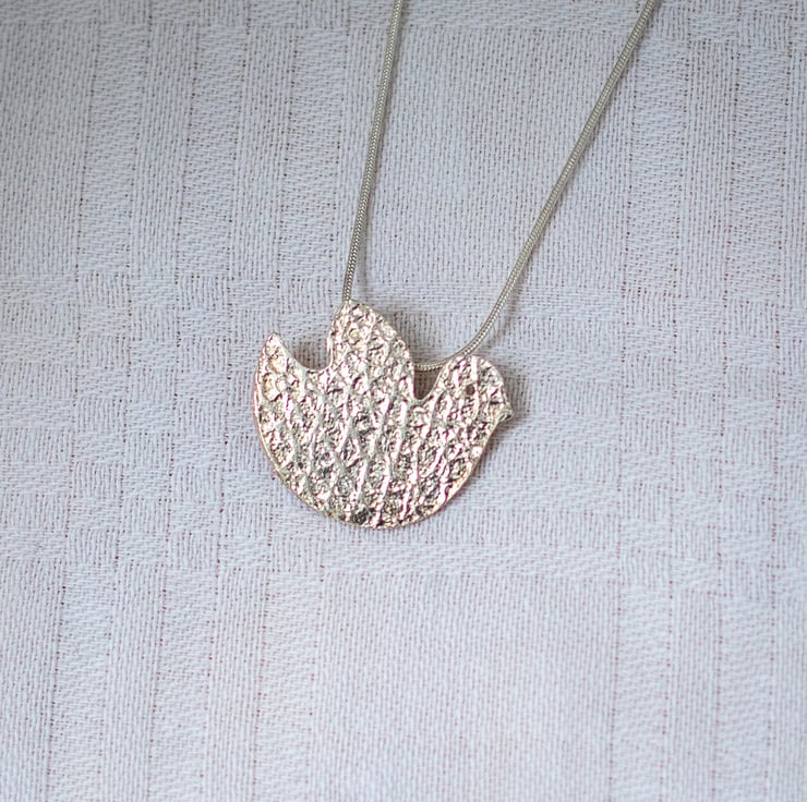 This handmade pendant is of a styised bird. Made using silver clay with a ripple effect pattern on it.