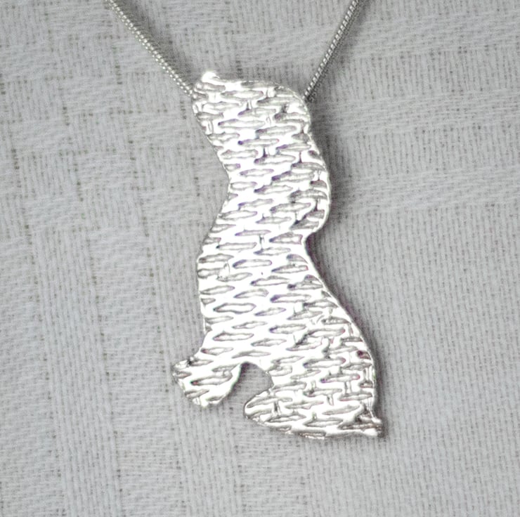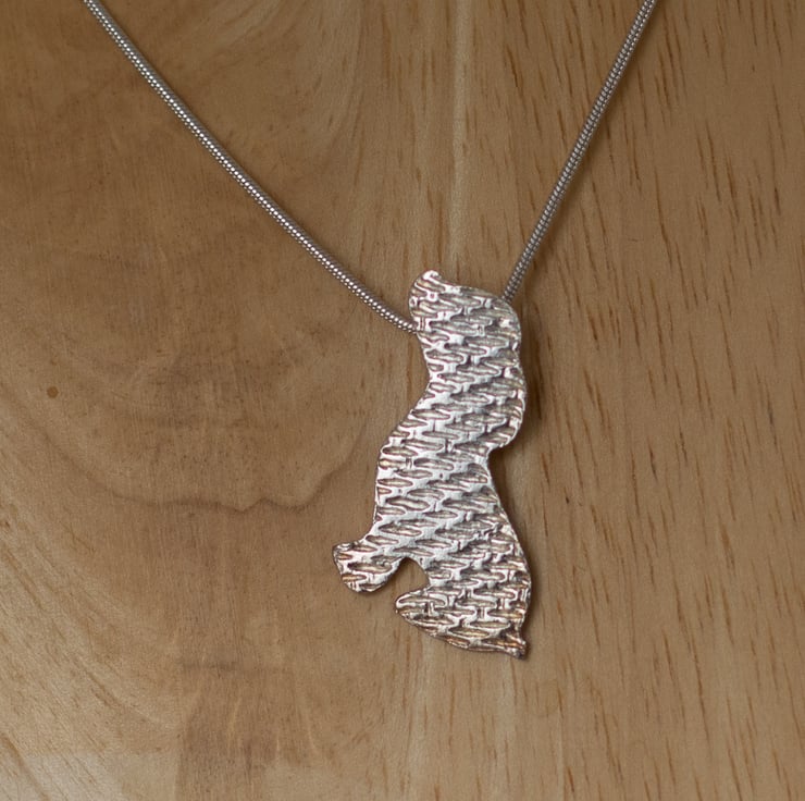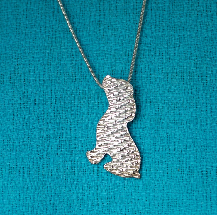 This handmade pendant of a sitting dog has a ripple effect on it and was made using silver clay.