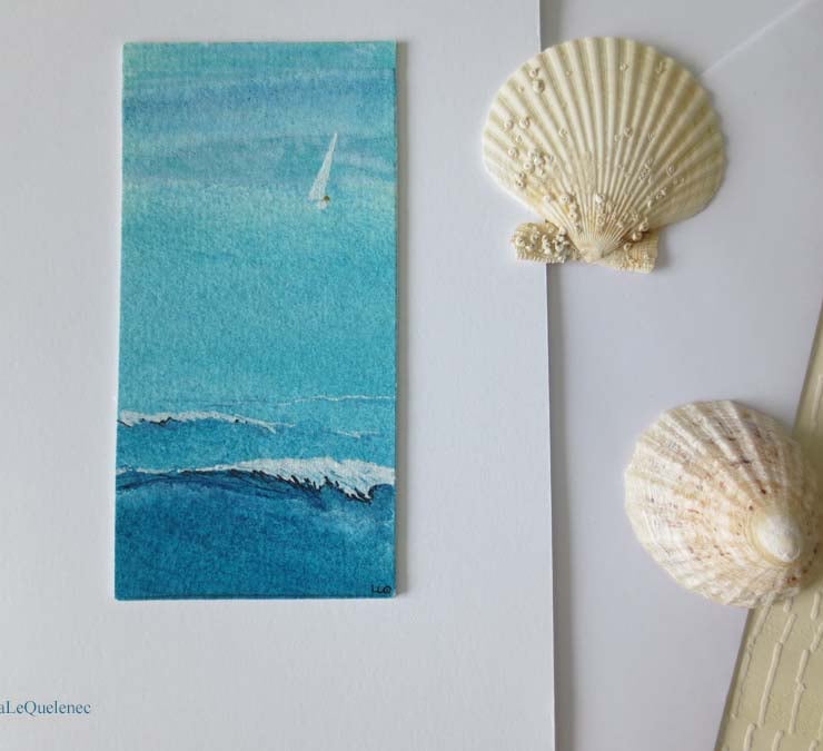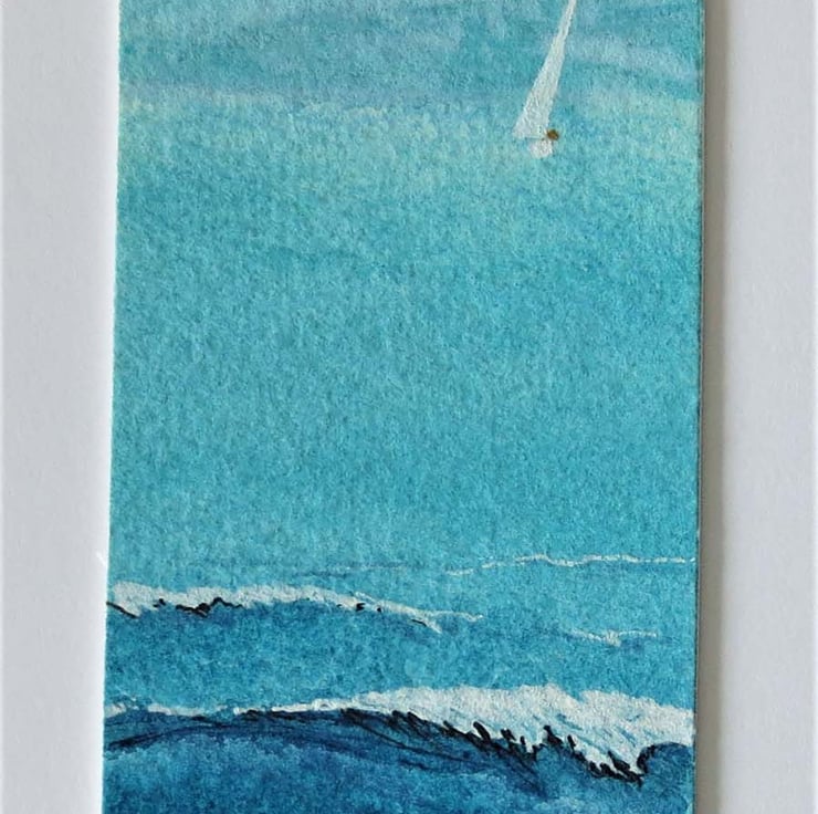 An original handpainted watercolour greeting card of a yacht sailing sailing into the distance on a turquoise sea. Left blank inside for your own messege for the sailor or traveller in your life.