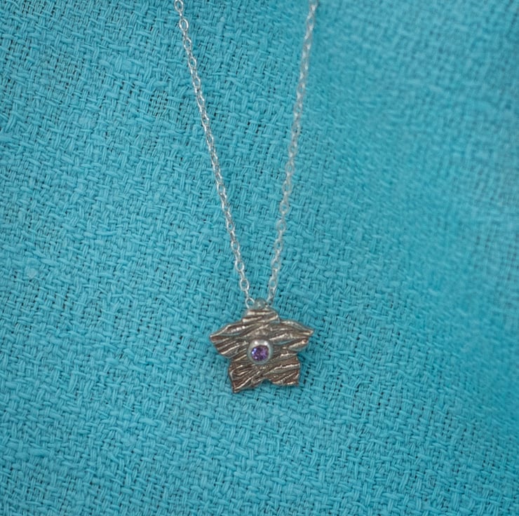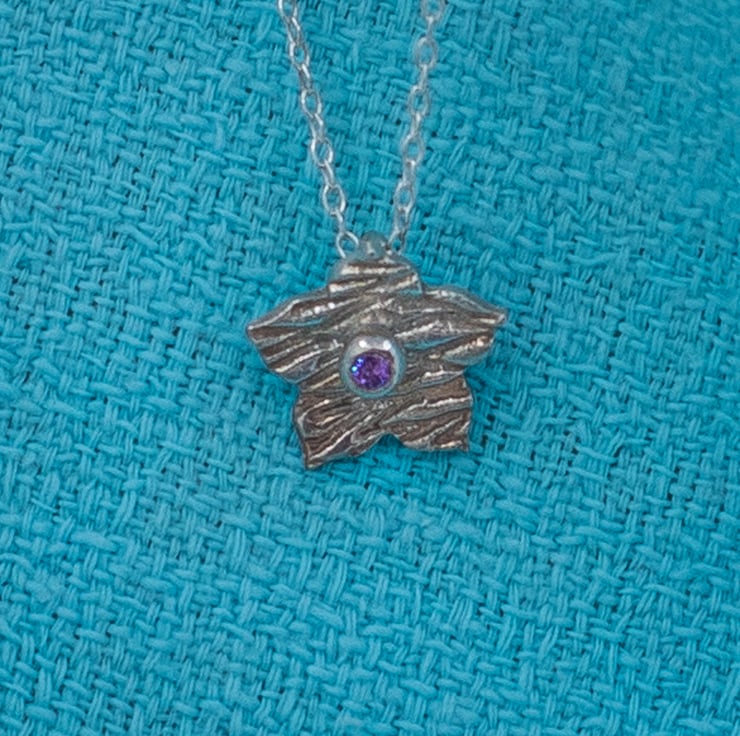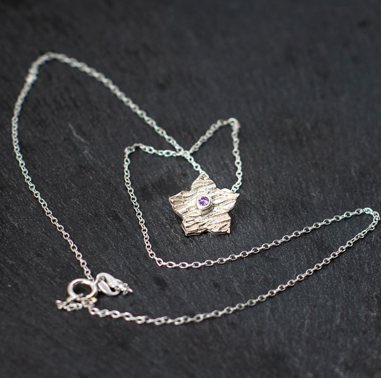Set with a purple/lilac cubic zirconia stone at its centre this hand made silver flower pendant is very dainty.