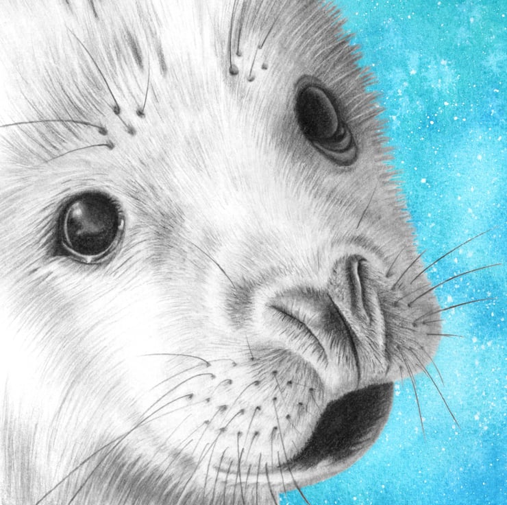 Fluffy baby seal pup. A framed and signed giclée print taken from an original graphite pencil drawing. The background features an aqua blue, turquoise watercolour wash allowing the black and white seal to really pop out of the picture! This is quite a statement piece to get noticed on your wall!