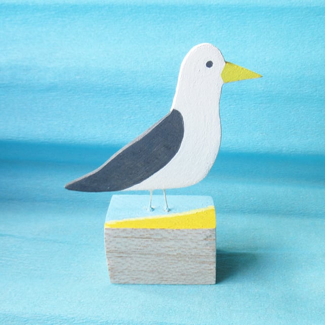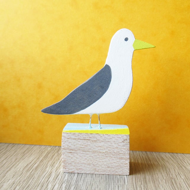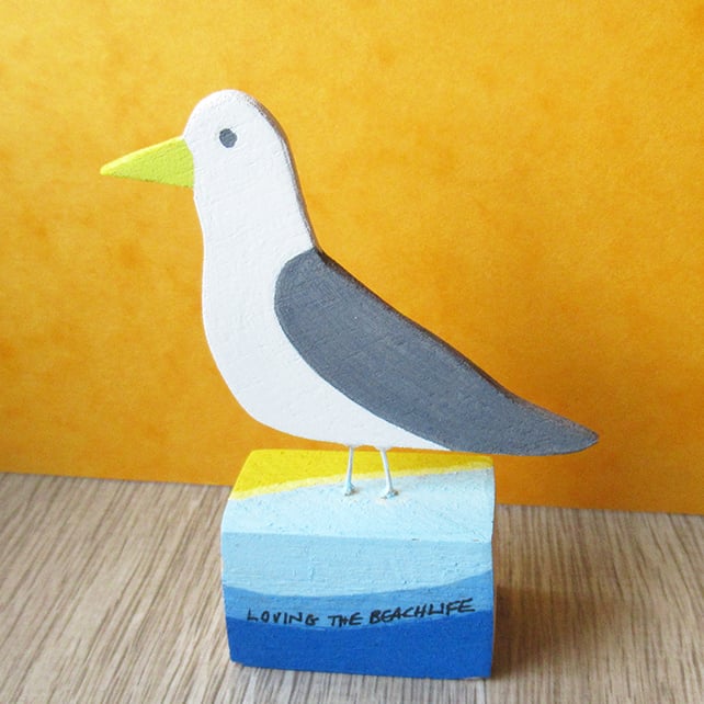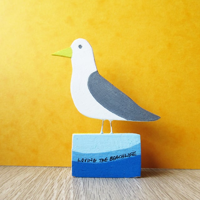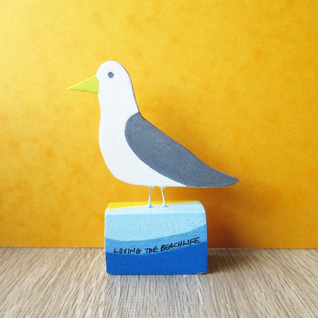 This little seagull stands proudly on a wooden rectangle stand with the text ‘Loving the beach life' written over a beach painted design on the front side.