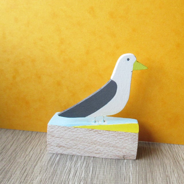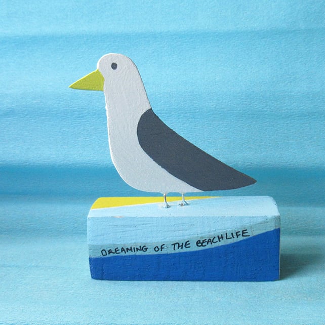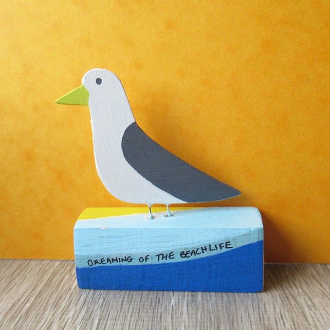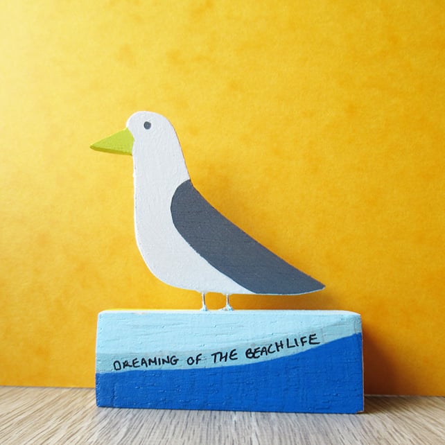 This little seagull stands proudly on a wooden rectangle stand with the text ‘DREAMING OF THE BEACHLIFE’ written over a beach painted design on the front side.