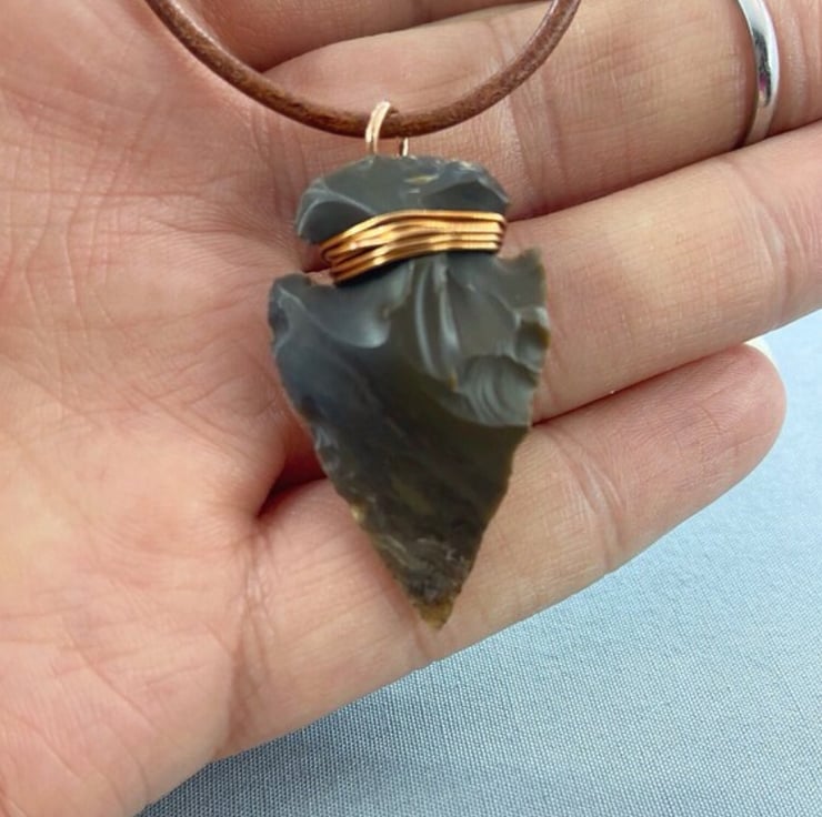 A unisex pendant featuring raw gemstone arrowhead suspended from a tan coloured leather cord.
