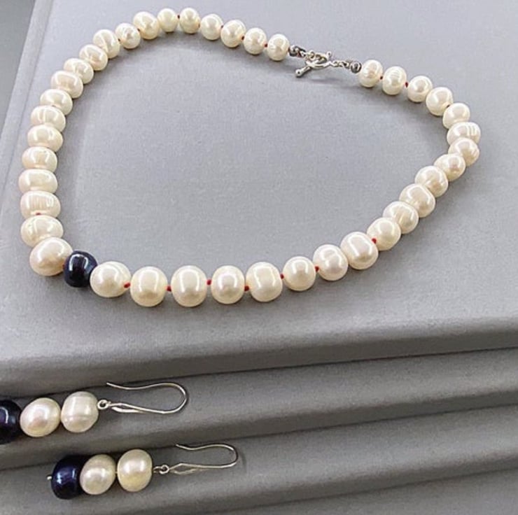 A beautiful bridal set comprising of necklace and earrings set featuring cultured pearls in ivory and peacock black which have been hand-knotted with red silk. Metals are sterling silver.