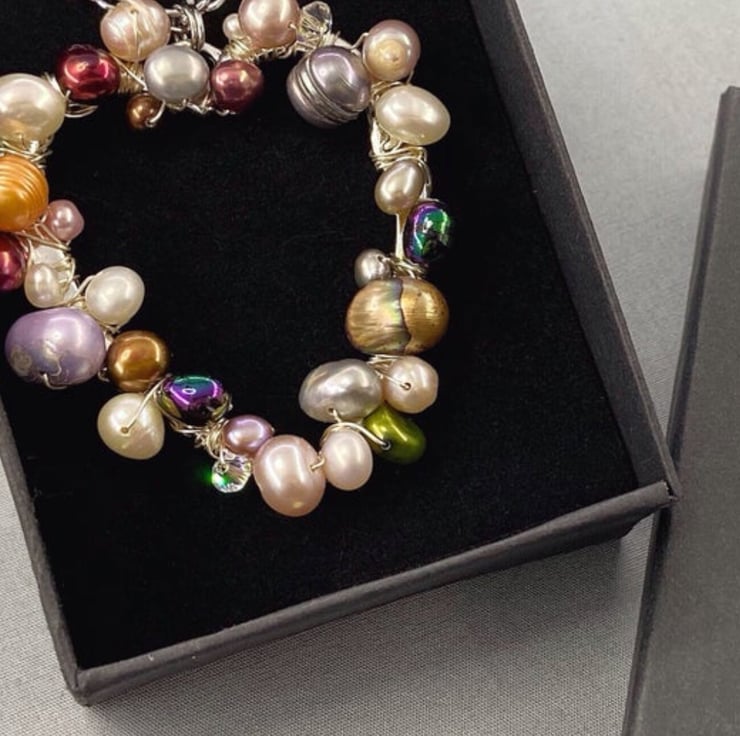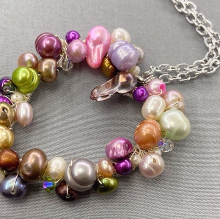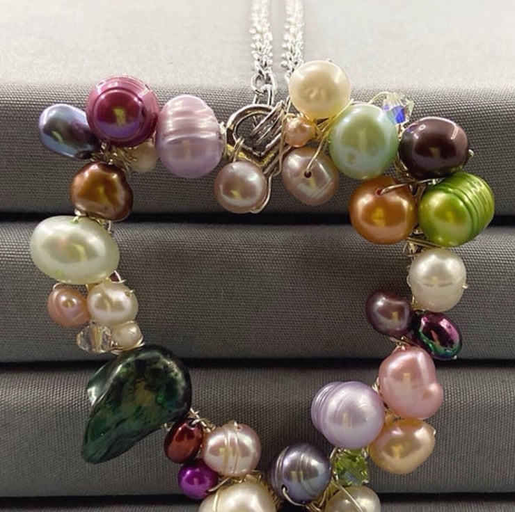 A very pretty necklace featuring a large heart charm that’s been wire wrapped with multicoloured cultured pearls and Swarovski crystals. The pendant hangs from a cable link aluminium chain.
