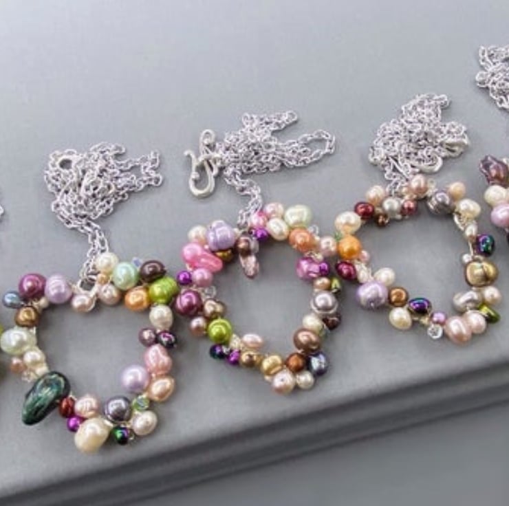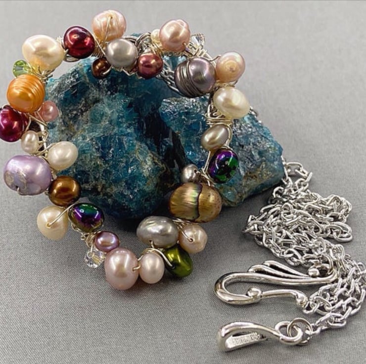 The pendant has been carefully wire wrapped with various shaped and size pearls using high quality sterling silver filled copper wire.