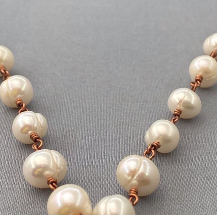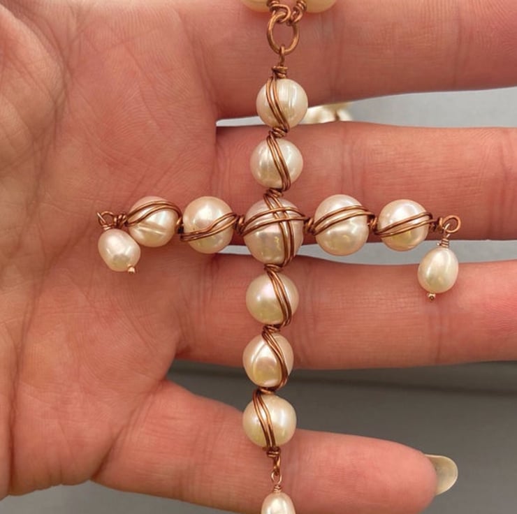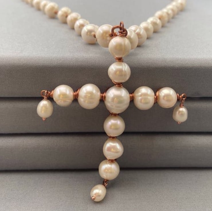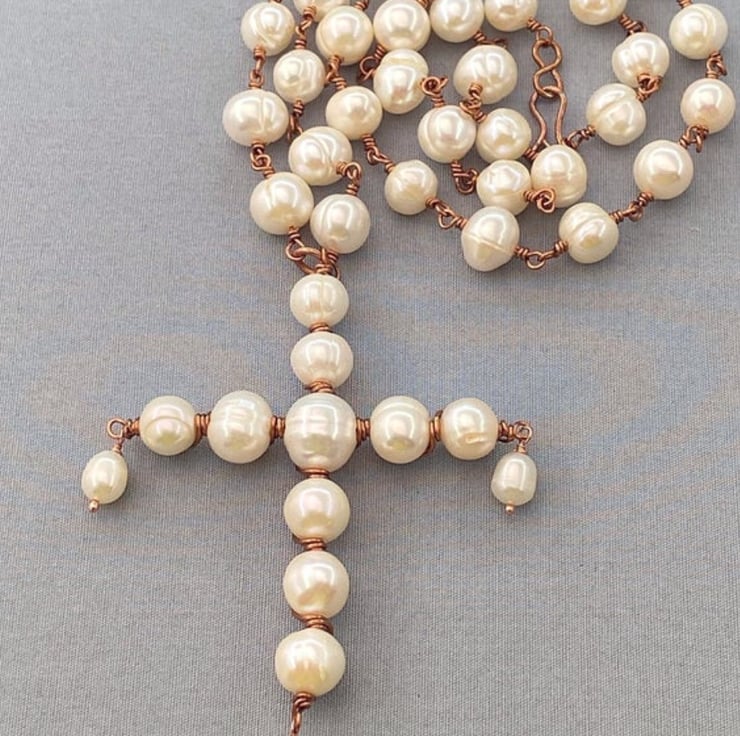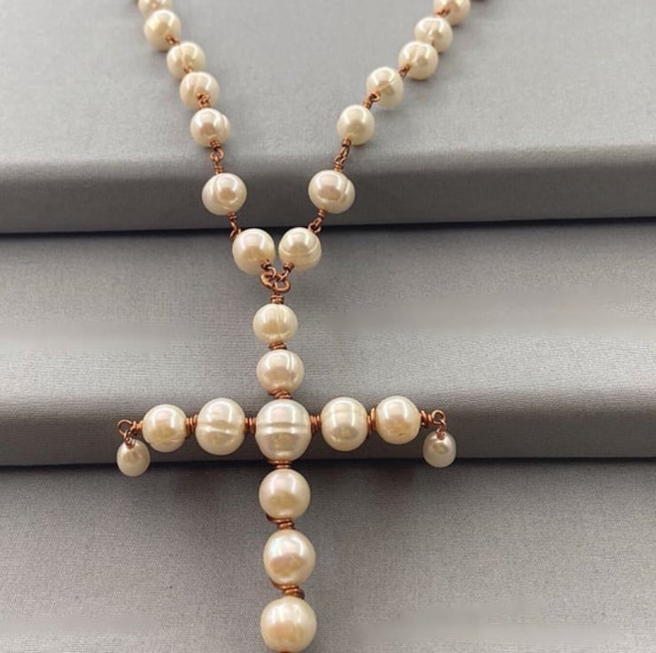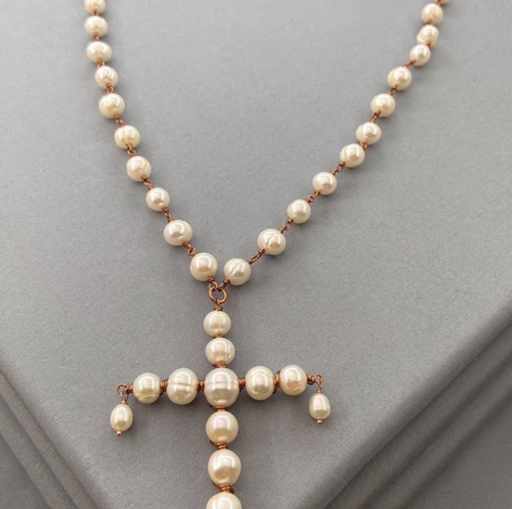 A stunning pendant necklace featuring all ivory cultured pearls and a cultured pearl cross pendant. The necklace has been rosary linked in between each pearl with copper wire. Copper improves with age in jewellery, it will go darker as it ages which looks great.