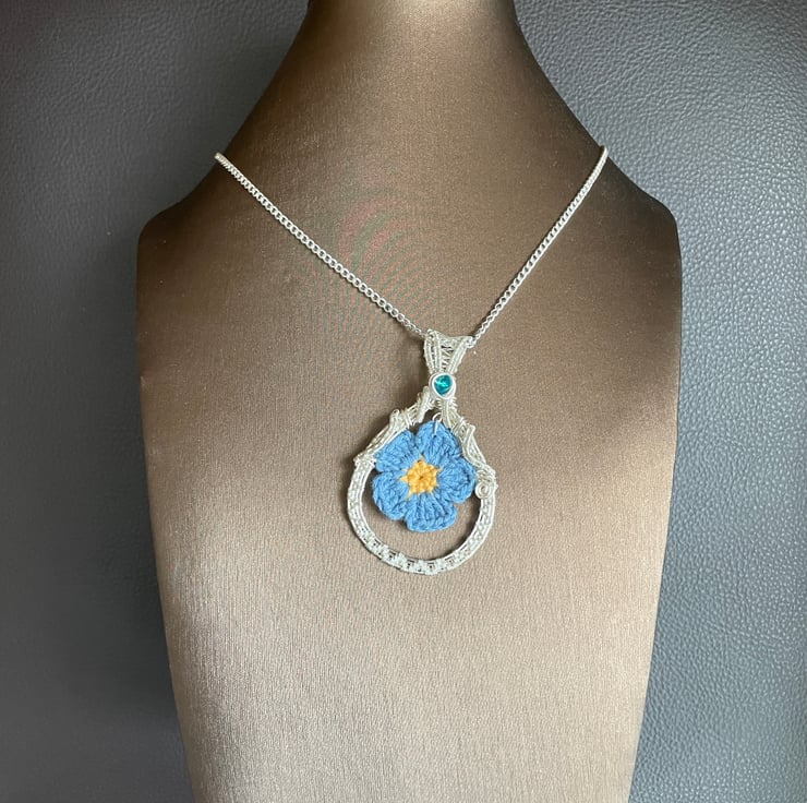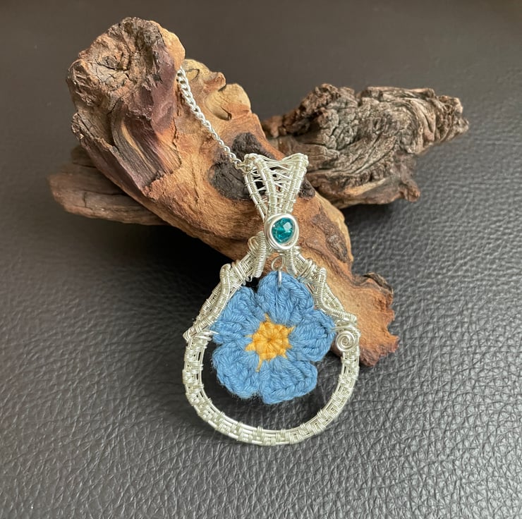 A mix of wool and metal works together in this unique creation. After purchasing some crochet forget me nots I decided to incorporate my love of wire wrapping with the flower to create something new and unique. Wrapped by hand using a range of silver plated copper artistic wire. This wire has an ultra thin coating that will inhibit tarnishing for longer. It would make a wonderful gift to those who love for knit and crochet, along with anyone looking for something a little different.