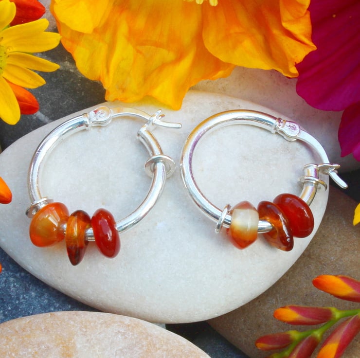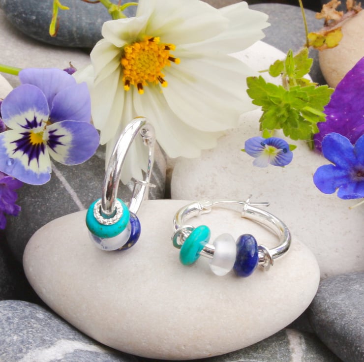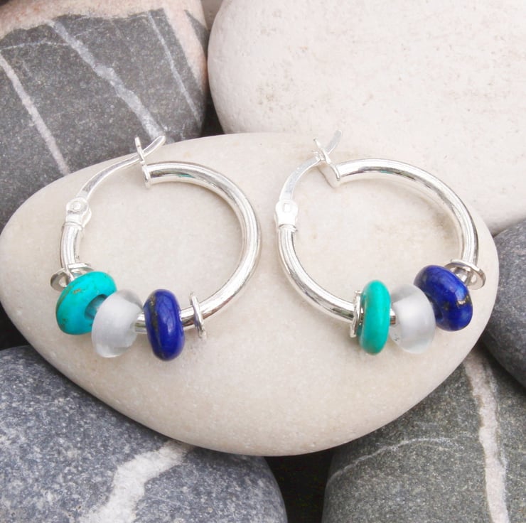 These three stoned sleeper earrings have been handmade by us in Yorkshire. The earring hoops are made from sterling silver and measure 18mm in diameter, they feature three semi-precious 6mm stones, which are Lapis lazuli, Rock Crystal and Turquoise, the holes in the centre of the stones have been covered by decorative, textured silver hoops.