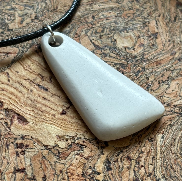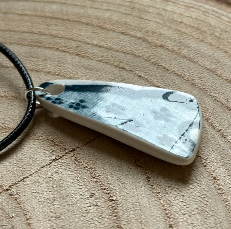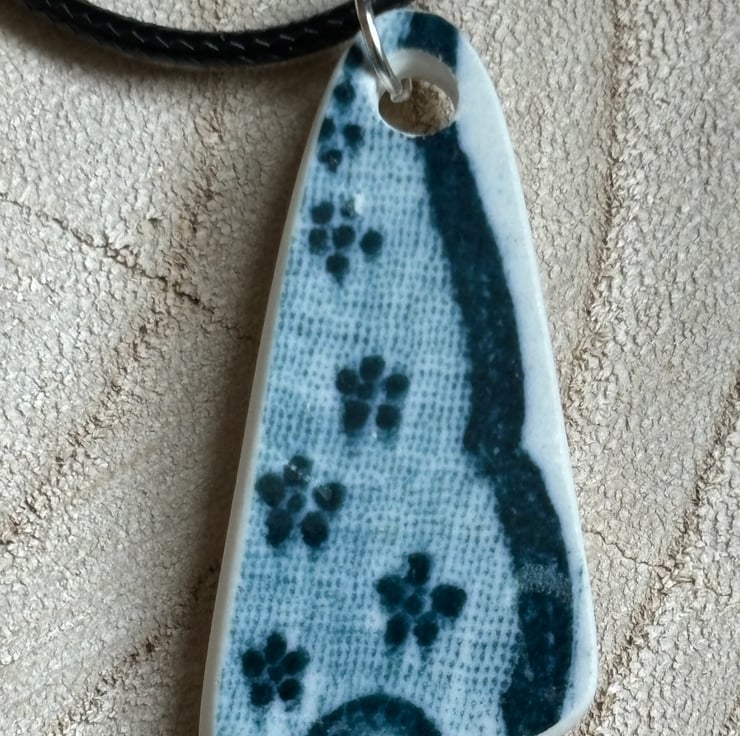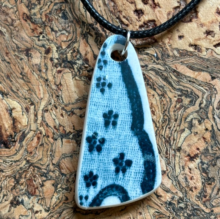 I found a distinctive shard sitting face up in the shallow water, strong shape with gorgeous blue and white pattern. After a thorough clean I managed to drill a hole and sand the piece. Although the front glaze has some scratches the shine is still bright, sides, backs smoothed and sealed with Eco Friendly sealant.