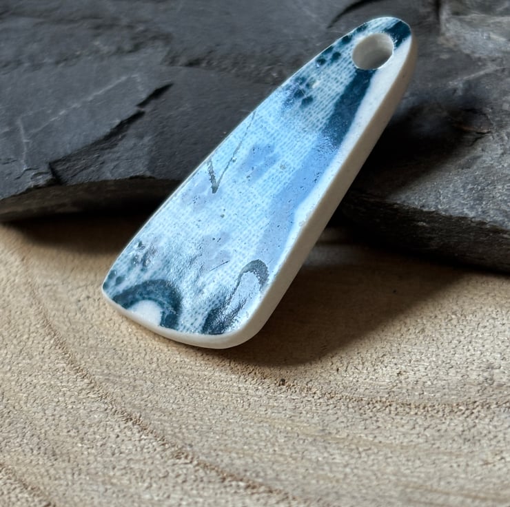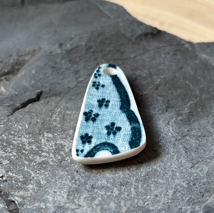 I found a distinctive shard sitting face up in the shallow water, strong shape with gorgeous blue and white pattern. After a thorough clean I managed to drill a hole and sand the piece. Although the front glaze has some scratches the shine is still bright, sides, backs smoothed and sealed with Eco Friendly sealant.