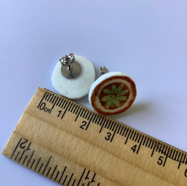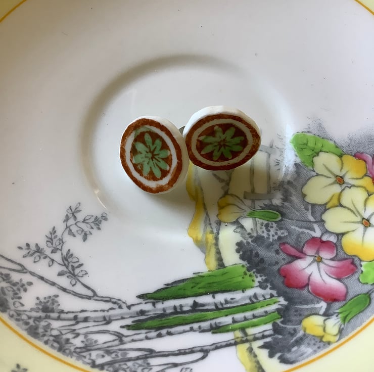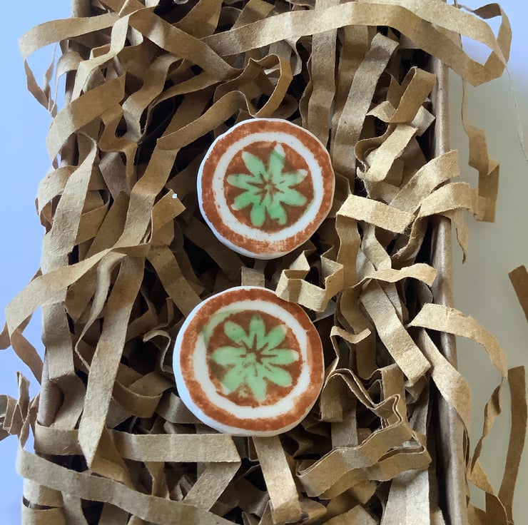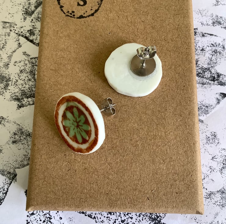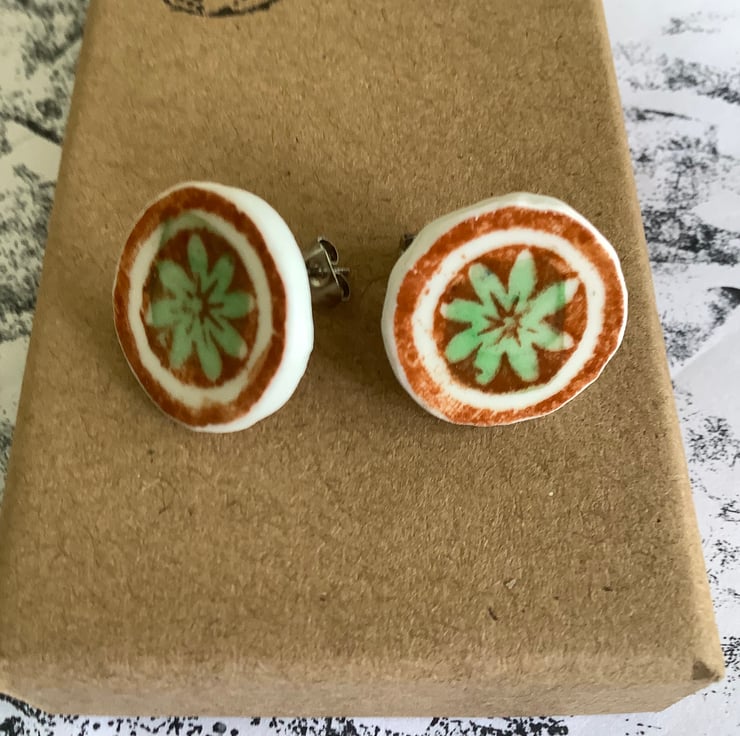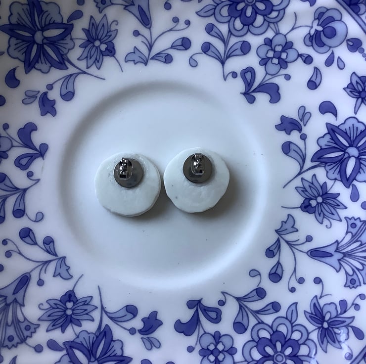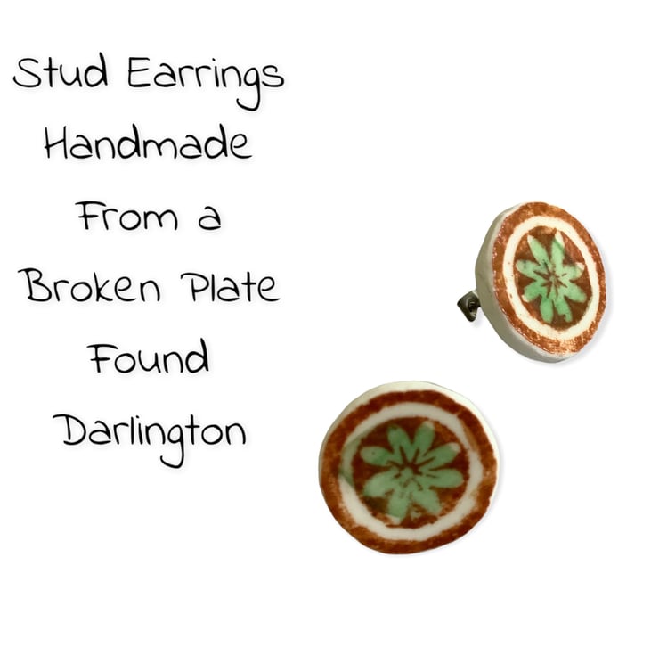 These earrings are made from the outer edge pattern of a broken plate, I have quite a lot of shards from this plate and intend to make more earrings and pendants however, everything made will be unique and one of a kind. No two items will be the same. The ceramic is hard and strong with the glaze in tact, for these earrings I have used hypoallergenic stainless steel posts and backs. The posts are set off centre to create a stud earring that hangs down below the lobe.