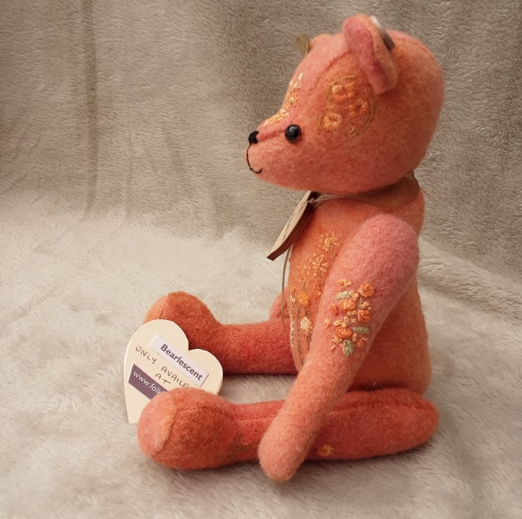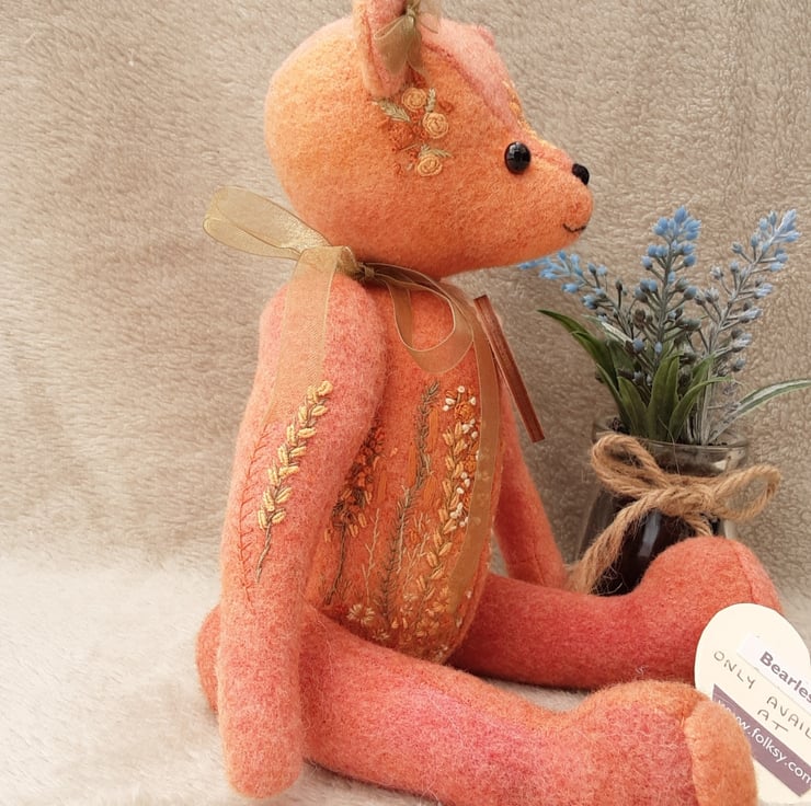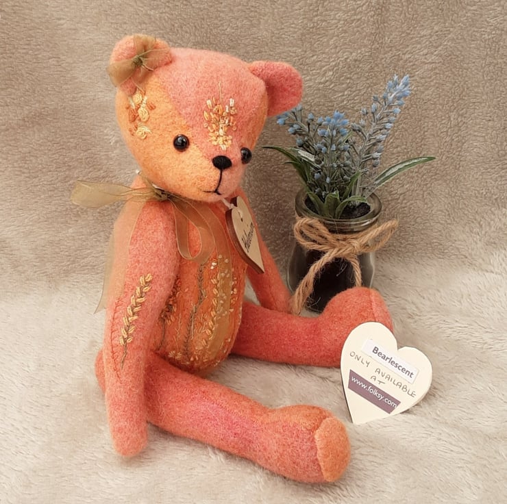 A unique hand embroidered Teddy bear hand crafted from hand dyed alpaca fabric in orange shades with hints of pink throughout.