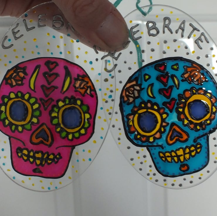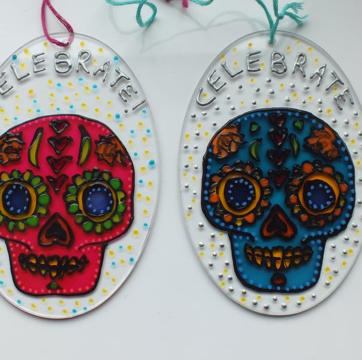 This listing is for one Day of the Dead sugar skull sun-catcher - pink or turquoise.