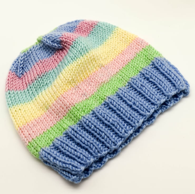 Hand knitted with unbelievably squishy baby soft acrylic yarn which is both practical and soft against new born skin. This beanie shaped hat is in a lovely pastel blue, yellow, pink, green and turquoise stripes.