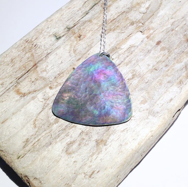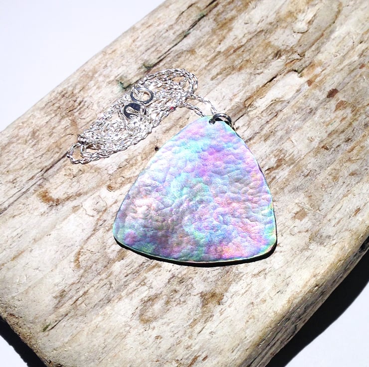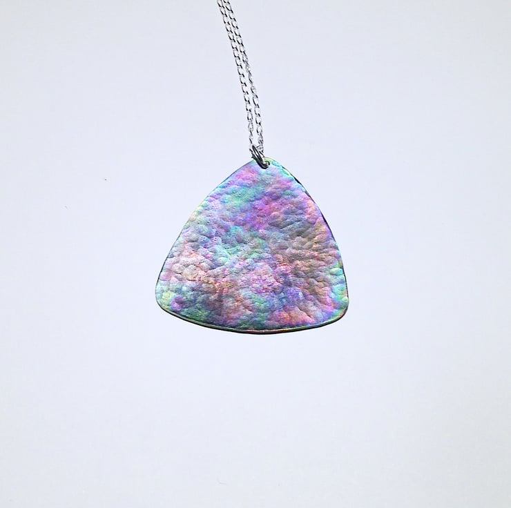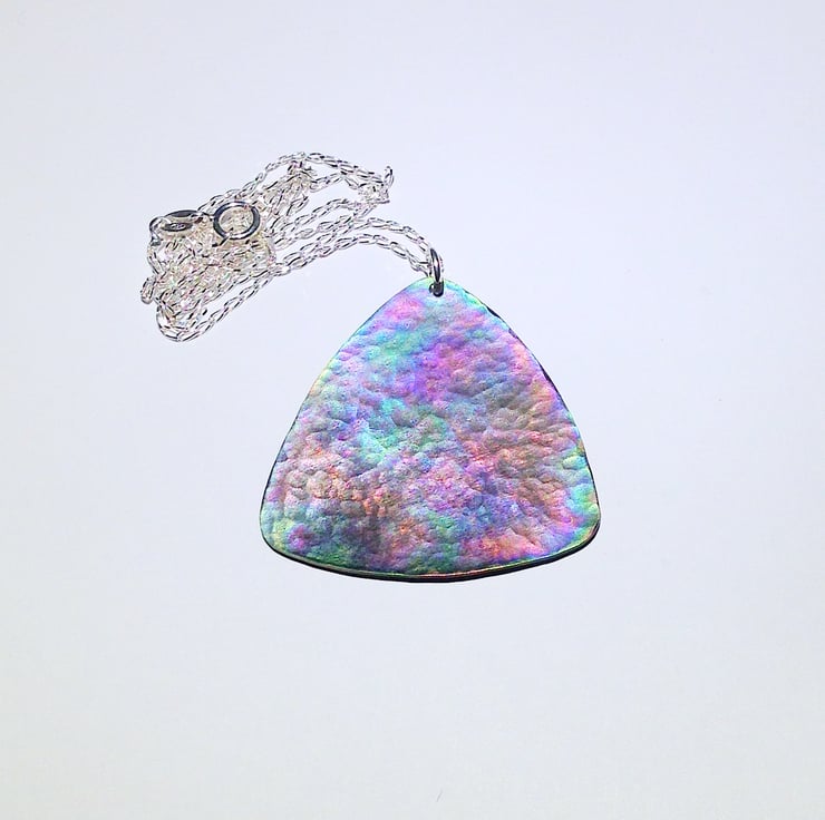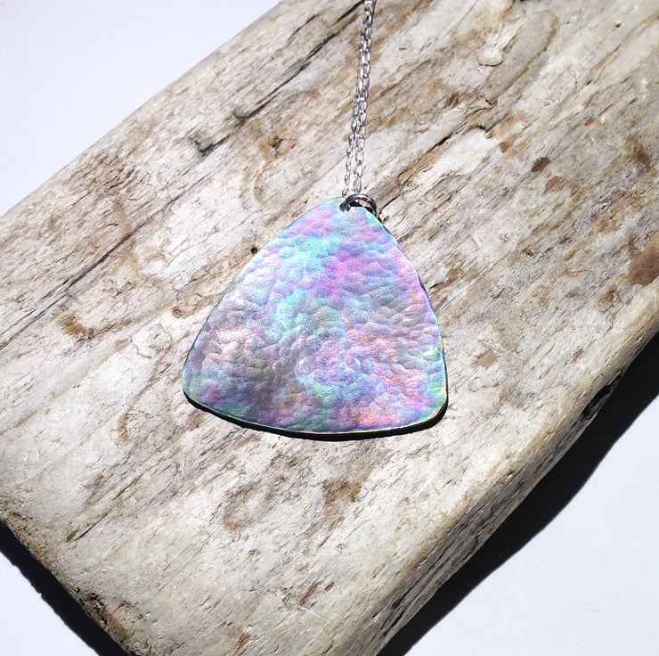 This titanium pendant necklace displays a range of attractive shades which really come to life when it catches the light.