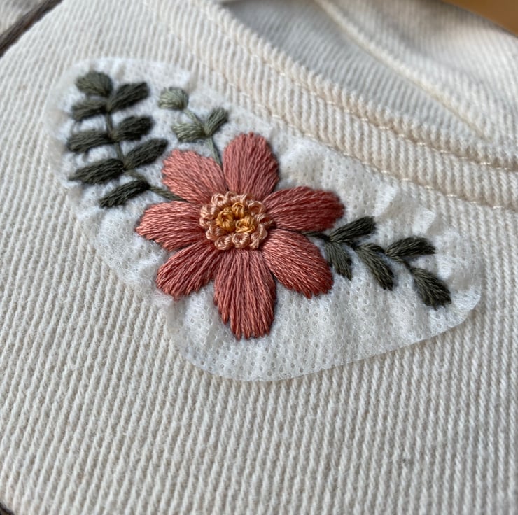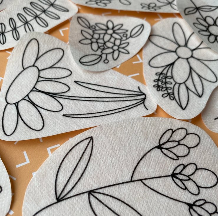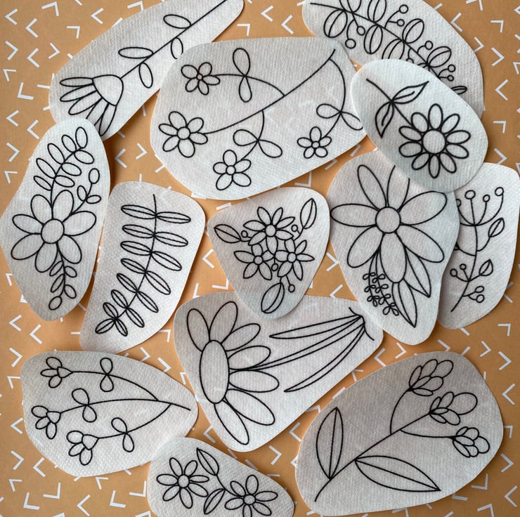 Stick and Stitch Floral Embroidery designs. 13 preprinted floral designs on soluble stabiliser. Stick to your chosen fabric, stitch your design then simply soak away.