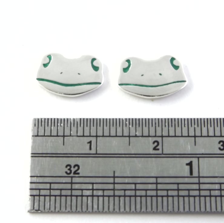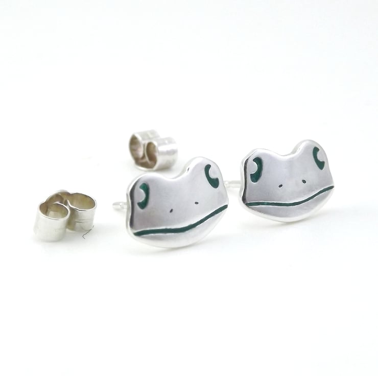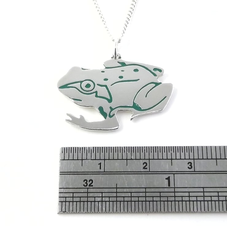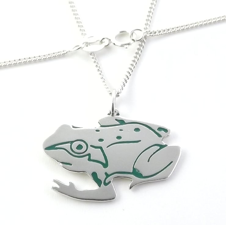 This frog jewellery set includes a pendant and a pair of stud earrings which have been lovingly crafted by hand. They are made from recycled sterling silver and are etched before being cut by hand, the edges are then smoothed using files and emery paper before they're carefully given their shape using a punch and hammer. Pins are then added to the back of the earrings. A green resin based enamel is added to the etched areas before they are polished. They come in a box made from 80% recycled cardboard.