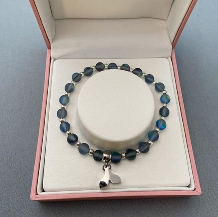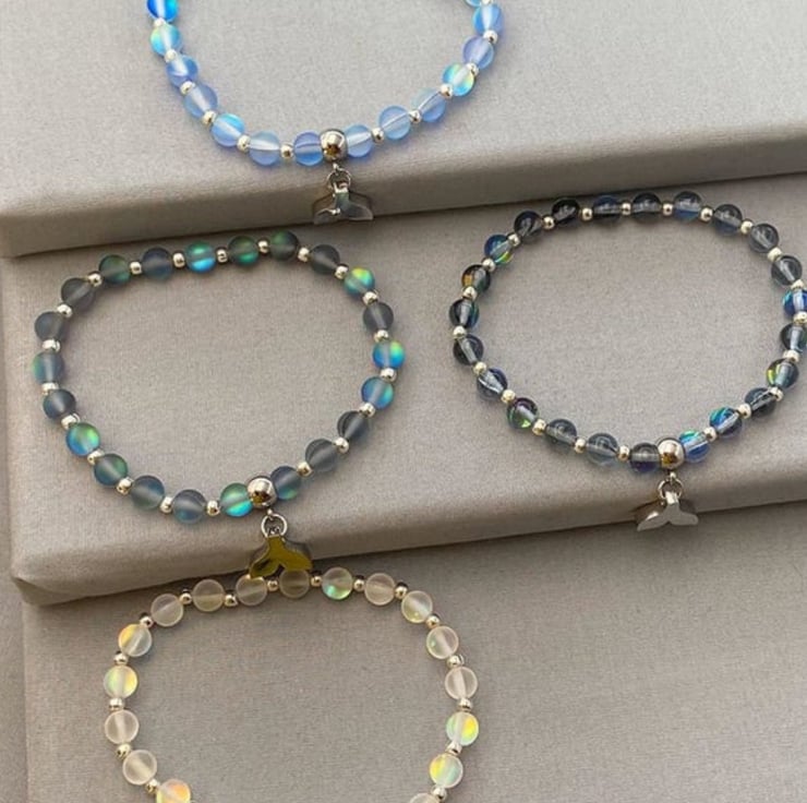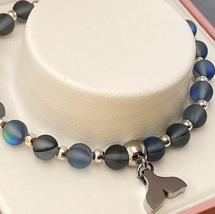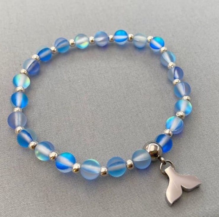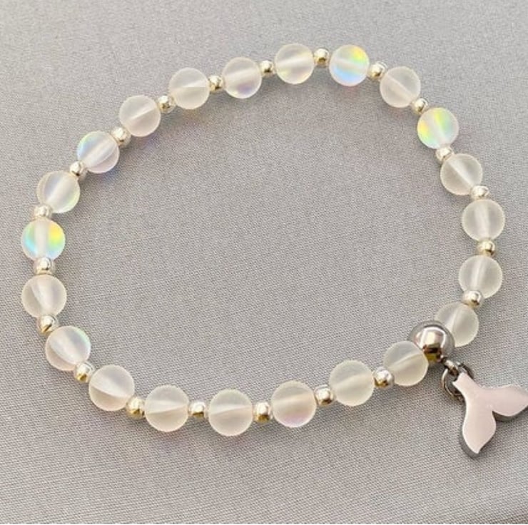 The iridescent effect on these fab stretch bracelets are beautiful. They feature glass beads that mimic moonstone as it has that inner glow and a stainless steel mermaid tail charm.