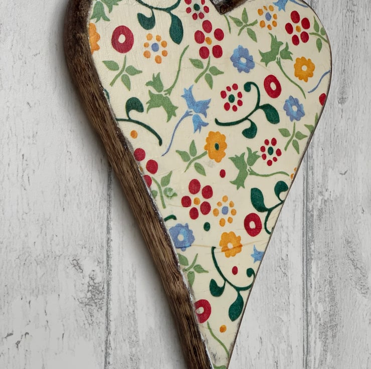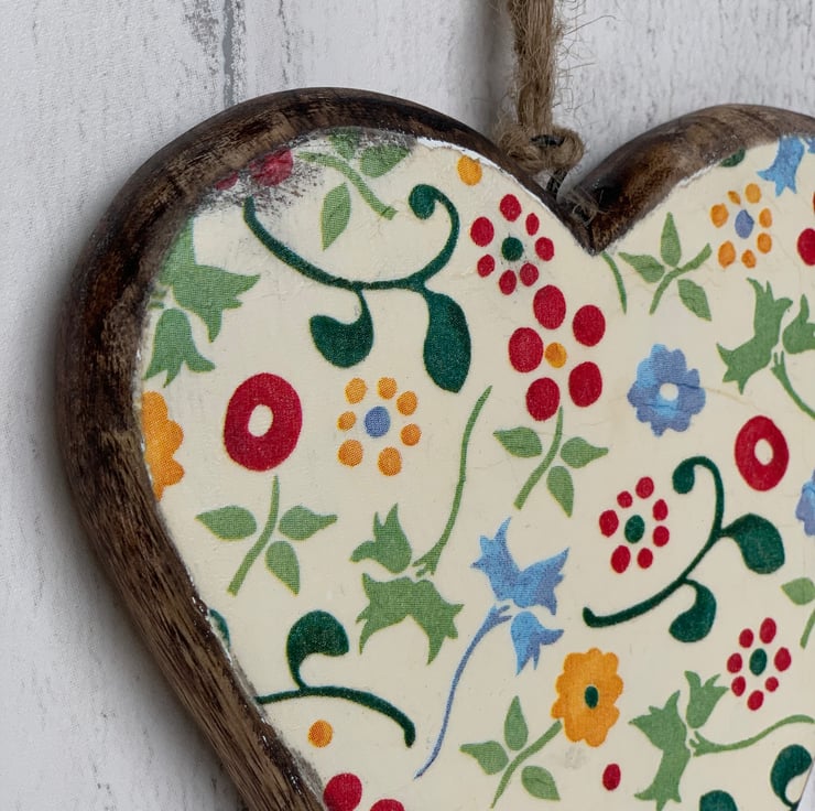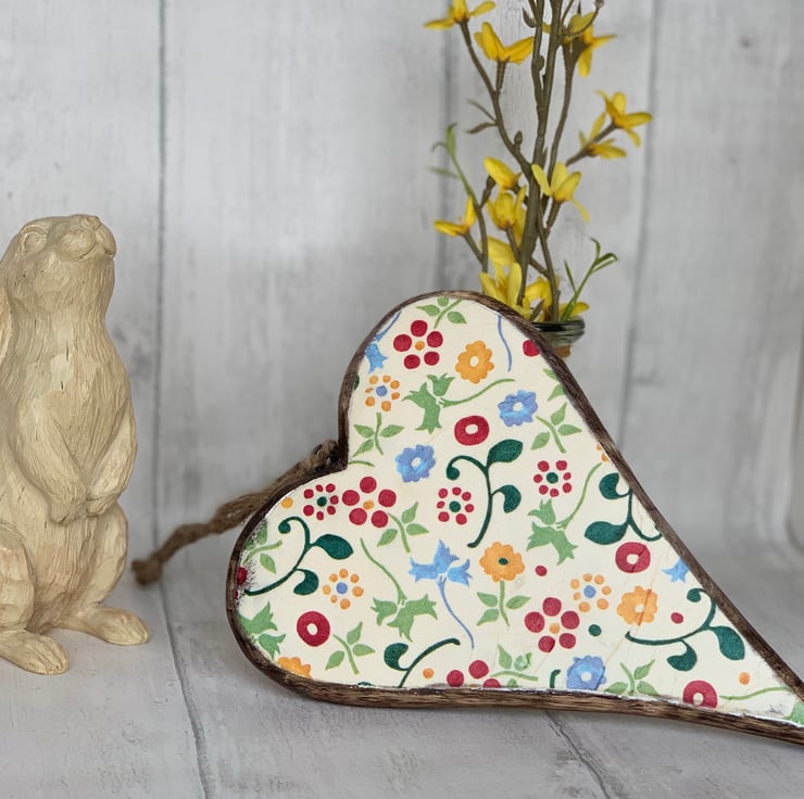 These gorgeous and unique rustic hanging wooden hearts are decoupaged in genuine Emma Bridgewater designs and have twine string for hanging.