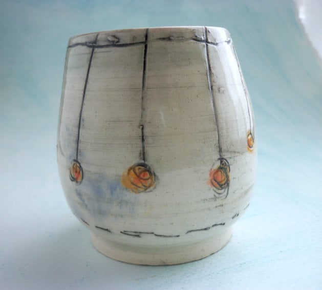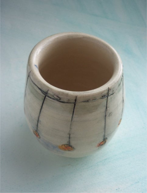 A small pot which has been hand thrown on the wheel. It has been made using white earthenware and decorated with the scraffito technique. The inside of the ceramic pot is white, where the outside includes vibrant mark making and features orange and black glazes.