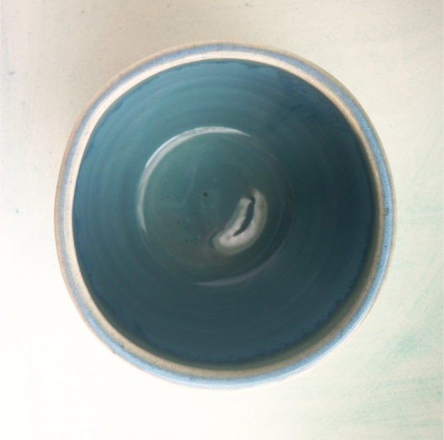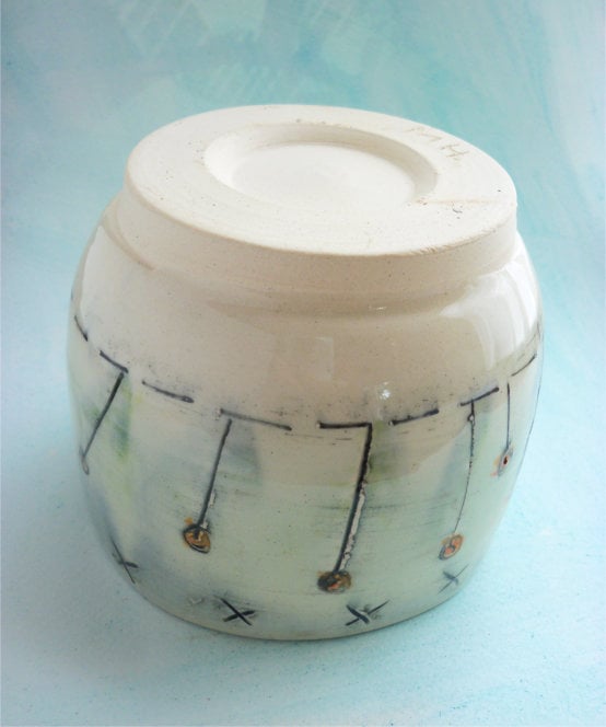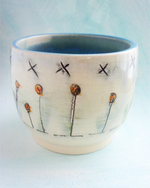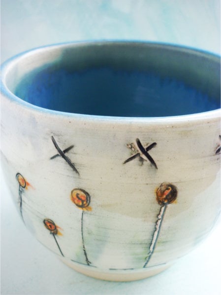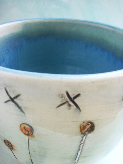 CERAMIC Bowl, hand thrown on the wheel using white earthenware clay. Inside is a light blue glaze and the outside is decorated with my design.