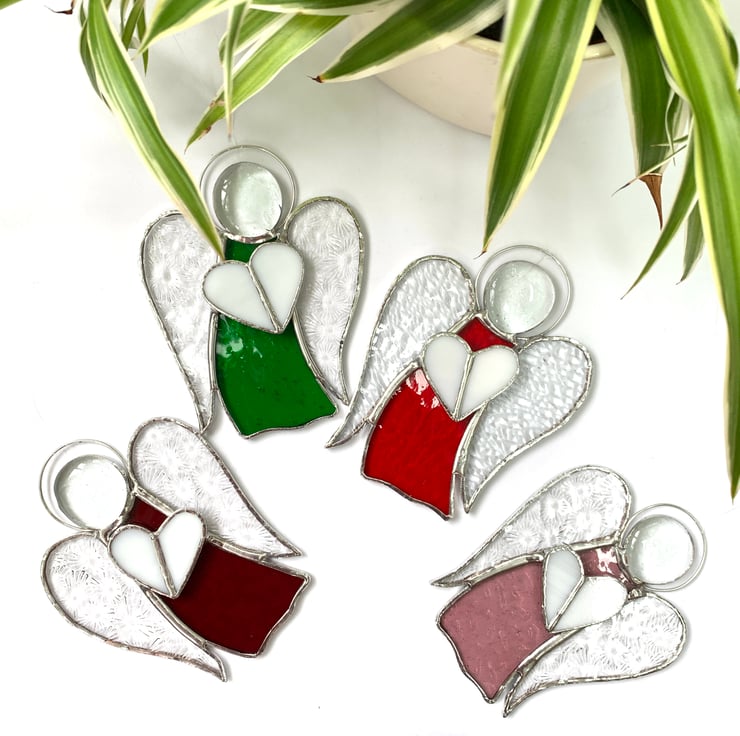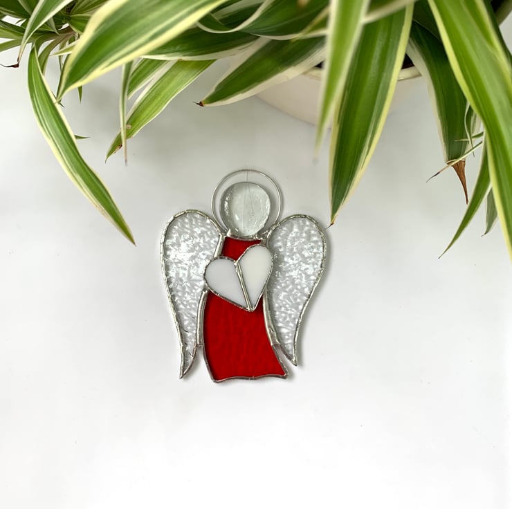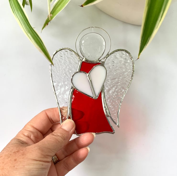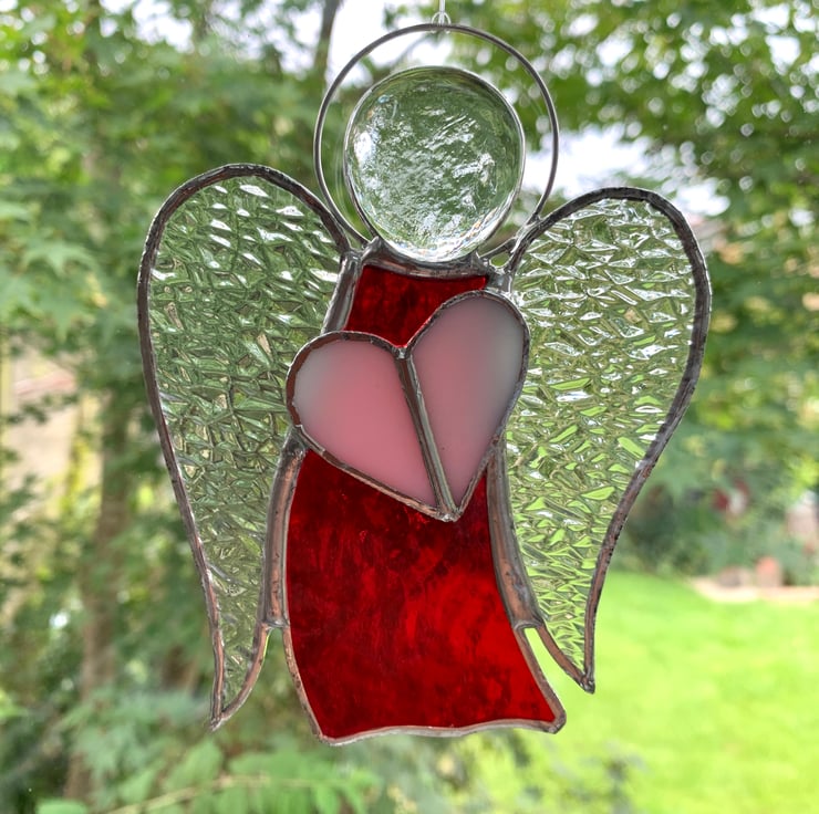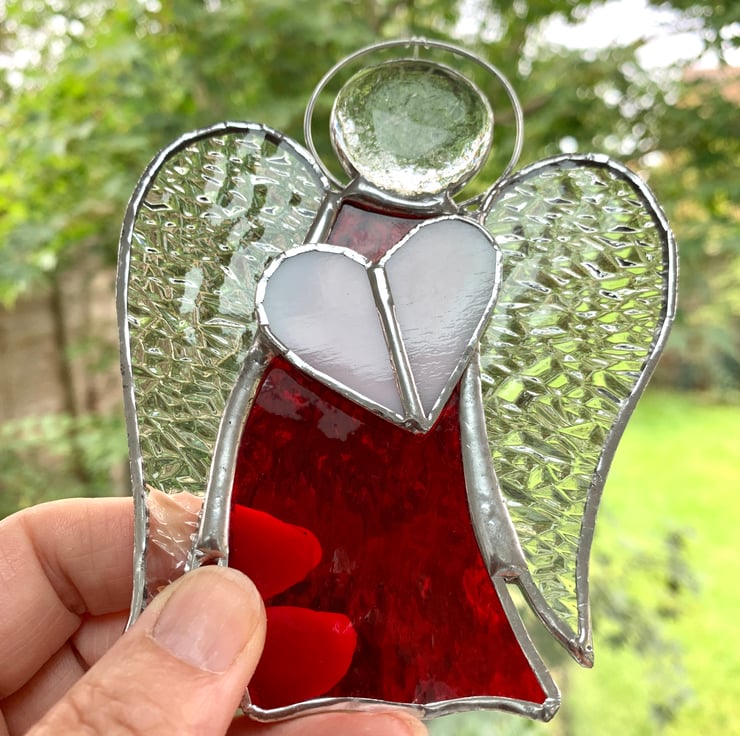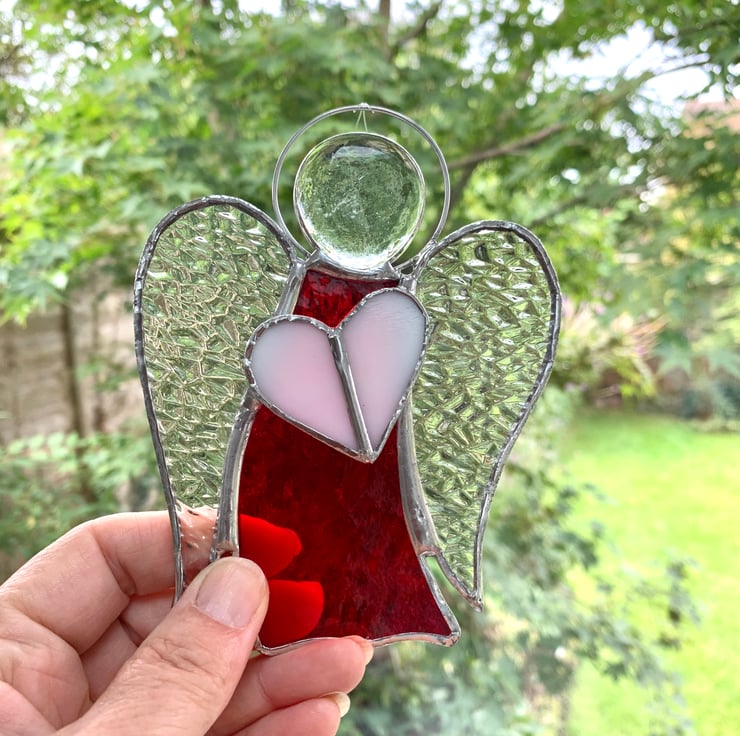 This particular angel has been made from bright red rough rolled glass, clear ice crystal glass has been used for the wings and the heart is white opaque glass (although in the photo it looks pinky). A large glob has been used for the head and wire for the halo.