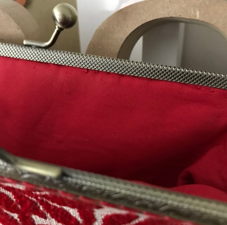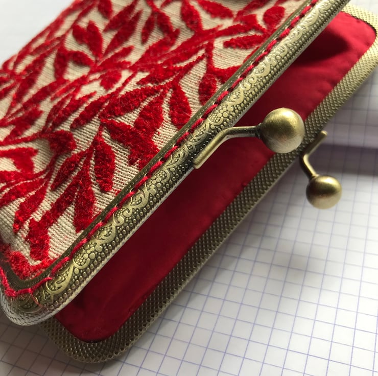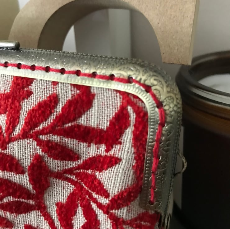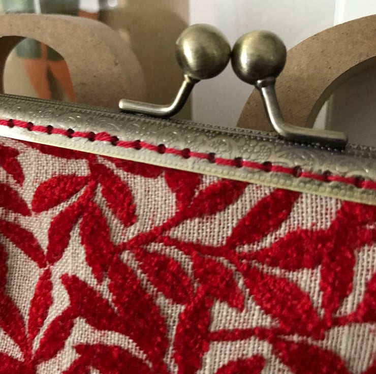 A beautiful clasp purse with a vintage feel about it. The fabric is a velour and just so soft and lush - I have limited amount of this fabric as it was from a sample "book" that was obtained from the supplier , via a recycle co. near me . I managed to get one purse out of all of the colours in the sample set . This one is a lovely shade of bright Red and has a red cotton lining. It would look great for a evening out or a special occasion. Just ready for a Christmas occasion. It is set in a 15cm antique brass effect clasp frame and has been sewn in with a complimentary red shade of thread. The measurements are 20cm at the widest point and 14.5cm deep.