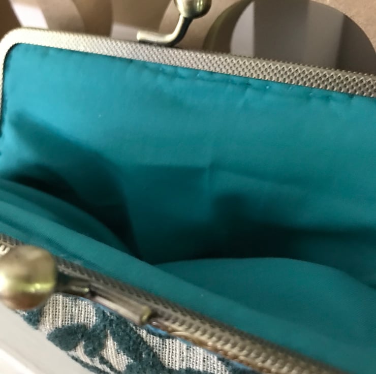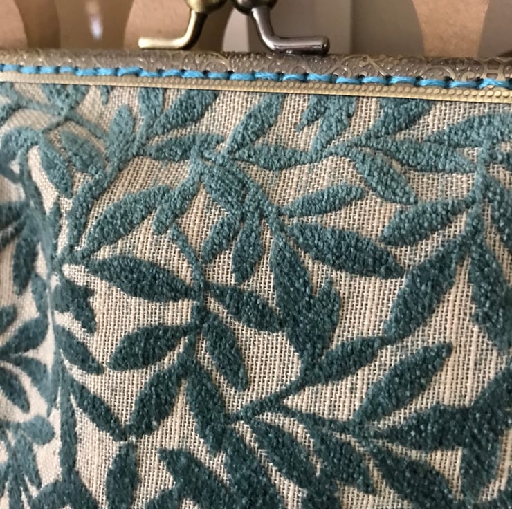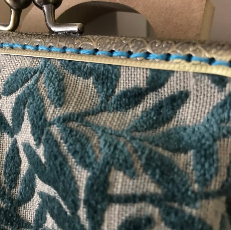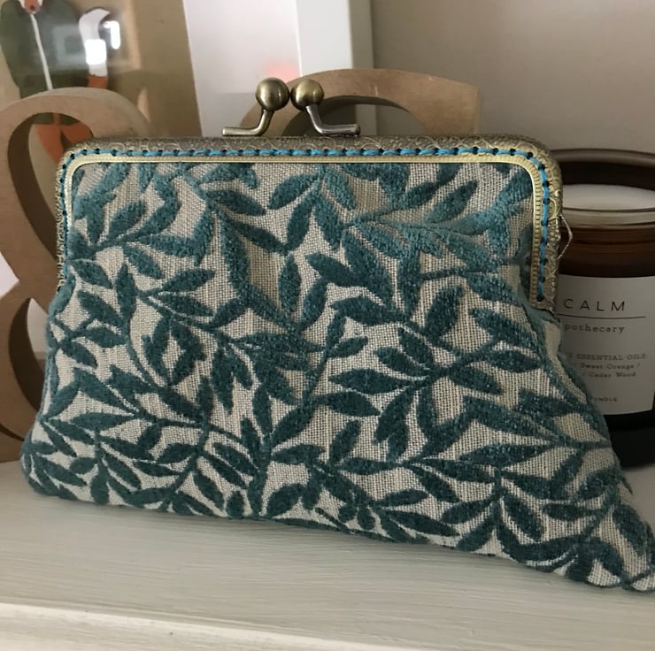 A beautiful clasp purse with a vintage feel about it. The fabric is a velour and just so soft and lush - I have limited amount of this fabric as it was from a sample "book" that was obtained from the supplier , via a recycle co. near me . I managed to get a few purses out of this shade and others are also on my Folksy page including a larger purse and a zipped bag. This one is a lovely shade of teal and has an matching teal cotton lining. It would look great for a evening out or a special occasion. Just ready for a Christmas or a summer do. It is set in a 15cm antique brass effect clasp frame and has been sewn in with a complimentary teal shade of thread. The measurements are 20cm at the widest point and 14.5cm deep.