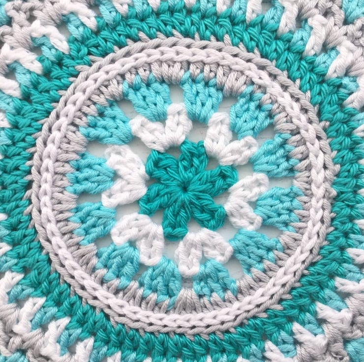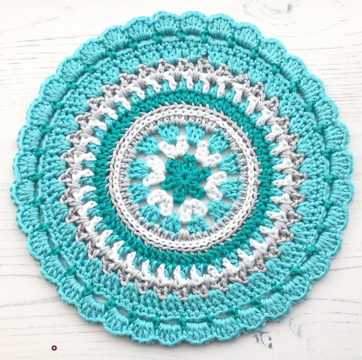 I have crocheted this mandala style table mat doily using a 100% cotton yarn in 2 shades of turquoise, grey and white.