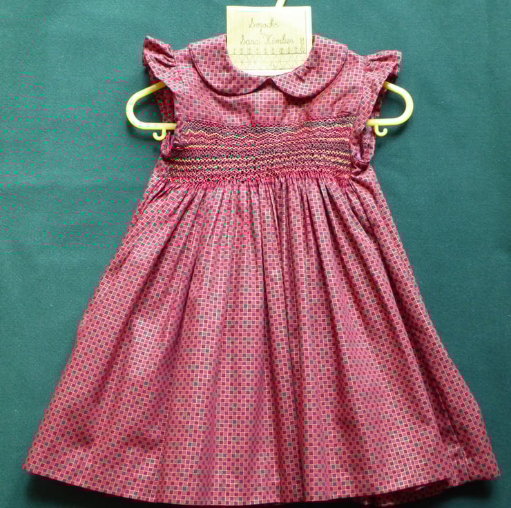 Hand embroidered smocked dress, made in cotton. Traditional burgundy, green and gold tiny tartan design on red background. Capped frill shoulder to enable warmer layer to be worn during winter months.