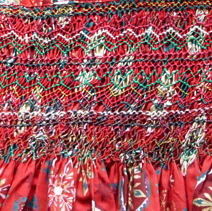 Hand embroidered smocked dress, made in cotton poplin. Mandala bauble design in reds, greens, gold and cream colours on a rich red background. Capped frill shoulders to enable a warmer layer to worn comfortably during winter months.