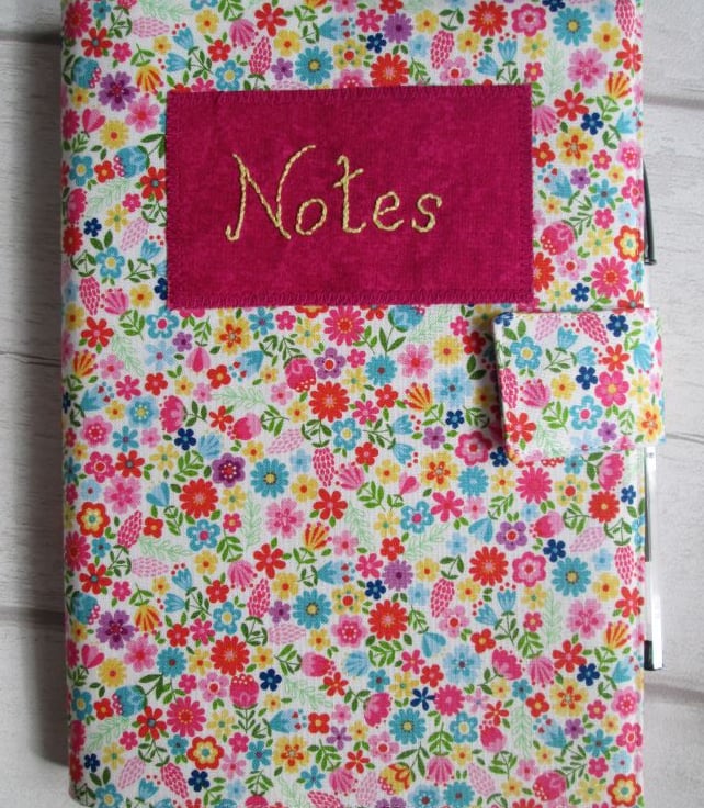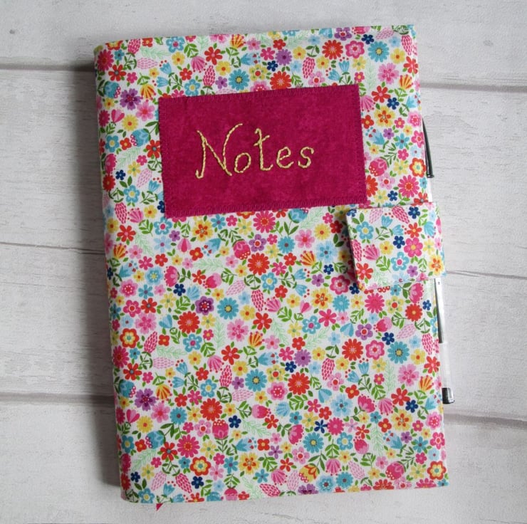 A really fun, reusable notebook cover in a colourful ditsy floral print, with a hand embroidered 'Notes' label. Lined with a coordinating floral print, it incorporates and handy ribbon place marker, elastic pen holder and magnetic strap fastening. Complete with a lined notebook and a pen it's ready to use or give as a gift. You can even upgrade to a Parker Jotter Pen for an extra £5.00.