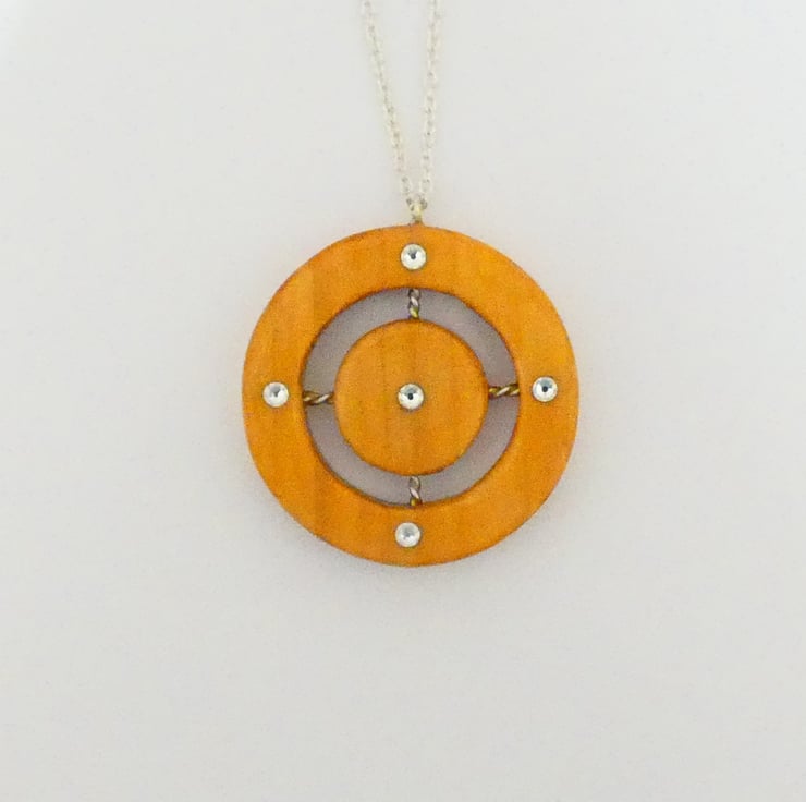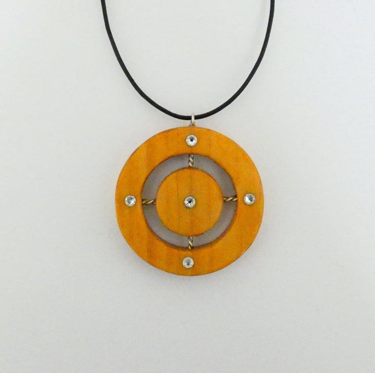 This one of a kind wooden circle pendant necklace with crystals is shaped similar to a ship's wheel. It has been handcrafted from a section of Pine Wood. It has been upcycled from reclaimed wood. A perfect present for an anniversary, birthday, Easter, best friend or as a Teacher Gift.