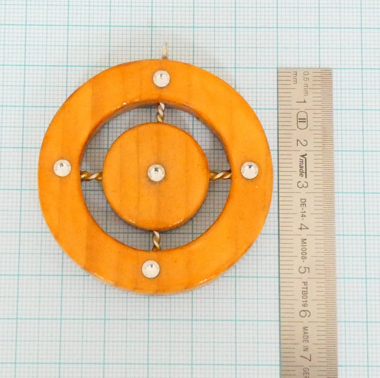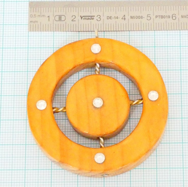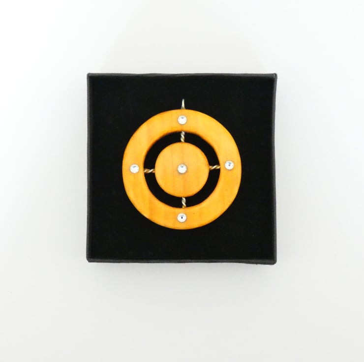 The two circles of this pendant were cut and shaped from a piece of wood, using a scrollsaw, before being sanded to a smooth finish. The circles were attached together with twisted wire. The pendant is smooth to the touch and has been finished with several coats of Lacquer to enhance the grain whilst also protecting the pendant.