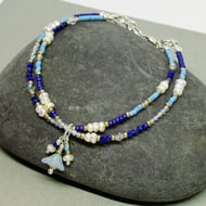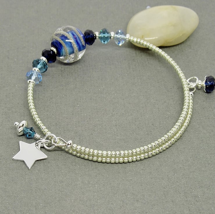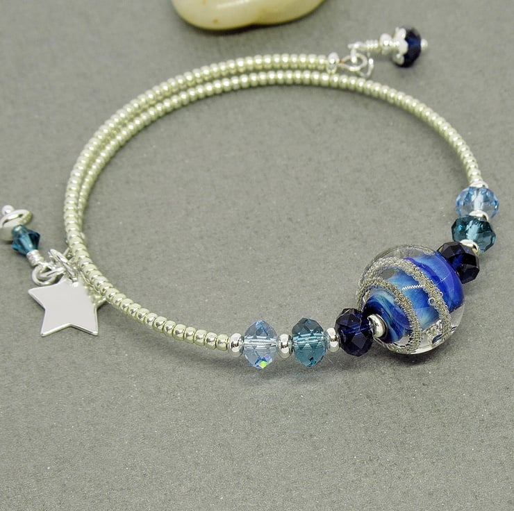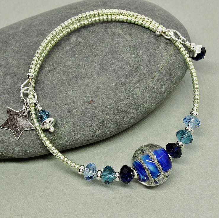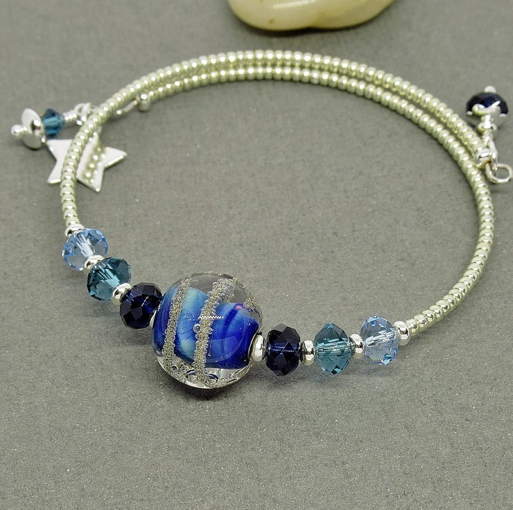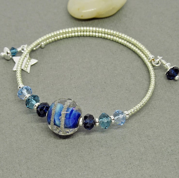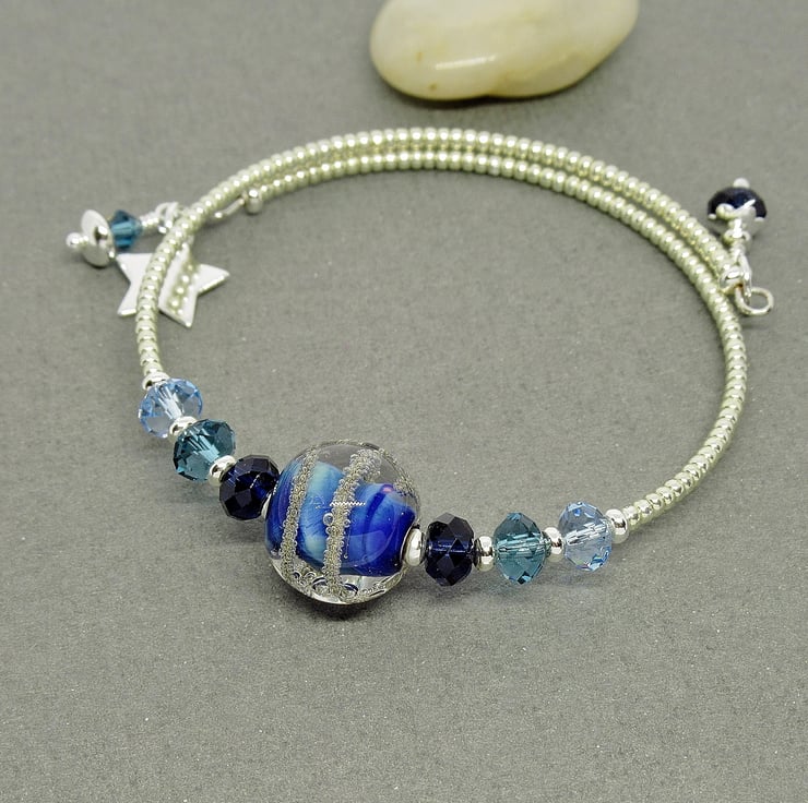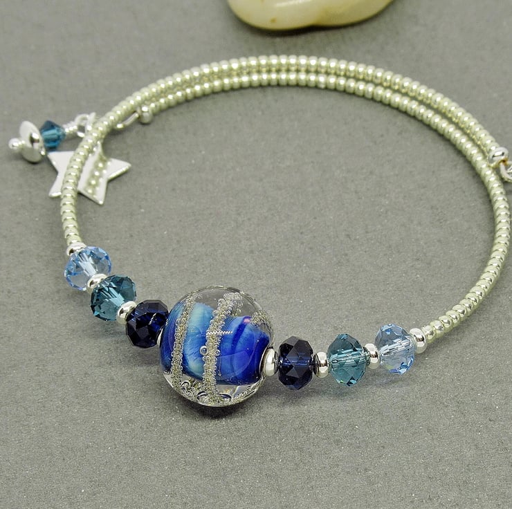 Blue lampwork glass bead memory wire bracelet featuring stunning artisan lampwork glass. This gorgeous lampwork glass bead has a core of blue silvered glass with ribbons of silver bubbles and has been encased in clear glass for added depth and shine. I have complimented it with Swarovski crystal rondelles in toning shades and silver Miyuki seed beads.