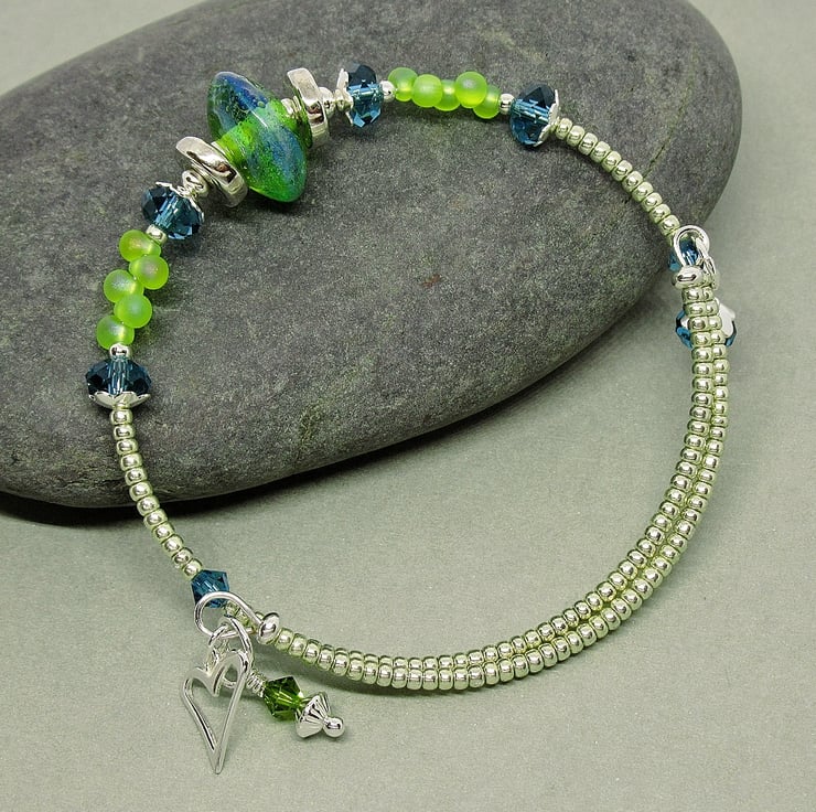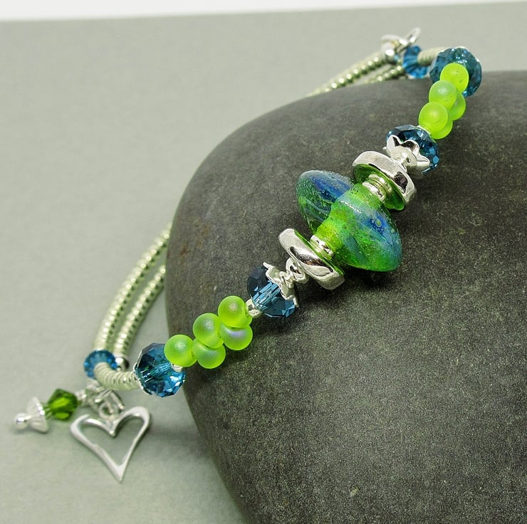 I have complimented the central bead with Swarovski crystal rondelles in turquoise blue, silver Greek ceramic disc beads, lime glass drop beads, and silver Miyuki seed beads. Bracelet is finished with sterling silver beads, a sterling silver heart charm and co-ordinating beaded charms.