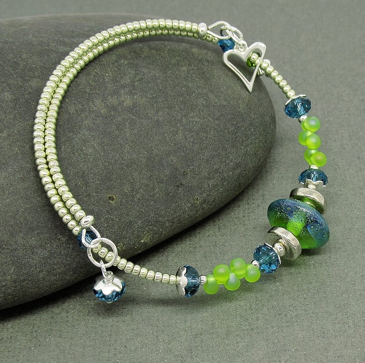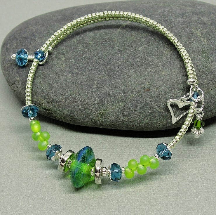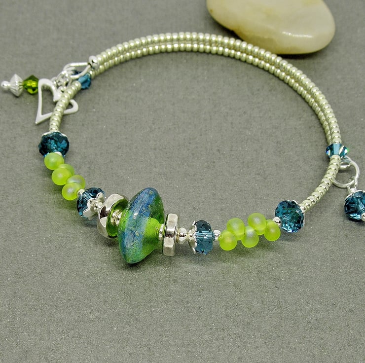Turquoise and lime memory wire bracelet featuring a beautiful artisan made blue green lampwork glass bead as it's focal point. This bead is made of green glass with surface detail in silvered glass giving a blue/green sheen.